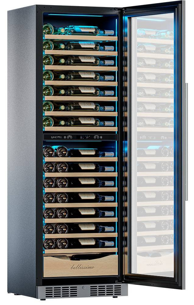 Несомненно, вас порадует наличие панорамного светодиодного освещения, которое подсвечивает каждую полку. Вы можете выбрать один из трех цветов: белый, янтарный и синий. Освещение не выделяет тепло и не нагревает бутылки с вином, позволяя вам эффектно демонстрировать вашу винную коллекцию.