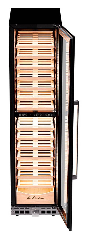 Вы оцените наличие панорамного светодиодного освещения (подсветка каждой полки), которое представлено в трёх цветах: белом, янтарном и синем. Оно не выделяет тепло и, следовательно, не нагревает бутылки с вином, что позволяет эффектно демонстрировать вашу винную коллекцию.