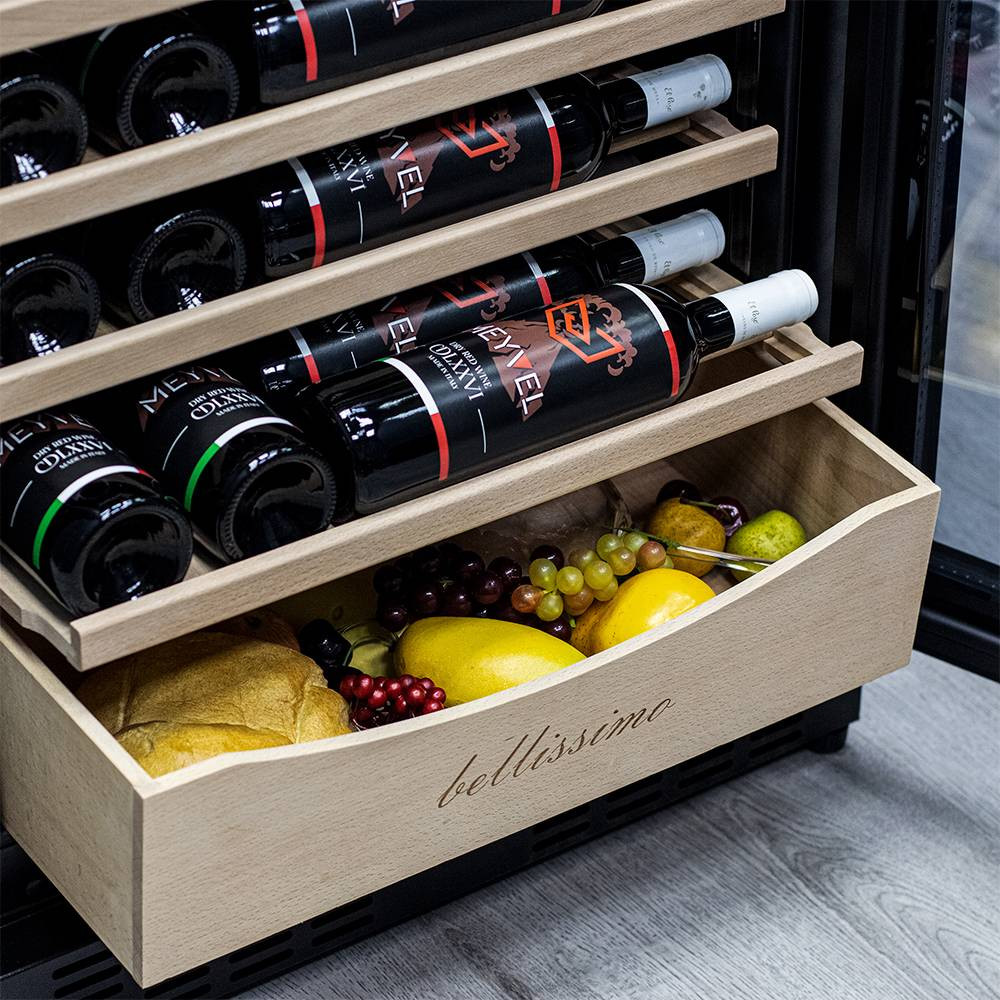 Внутреннее пространство винного шкафа разделено на две температурные зоны. Вы сможете настроить их так, что бы хранить все виды вина при идеальной температуре или установить разные значения, что бы напитки всегда были готовы к подаче. Так же в каждой зоне есть полка с увеличенным пространством. На таких полках Вы сможете разместить не только стандартные бутылки Бордо, но и Магнум. А если нужно разместить что-то побольше - то в этом случае можно вынуть одну или несколько полок. Внизу есть выдвижной ящик - в нем Вы можете хранить вино в бутылках или винные атрибуты (штопор, бокалы, аэраторы, декантеры, каплеуловители, термометры и т.д.) Если вынуть ящик, то можно разместить в демонстрационном положении до 6 бутылок вина.