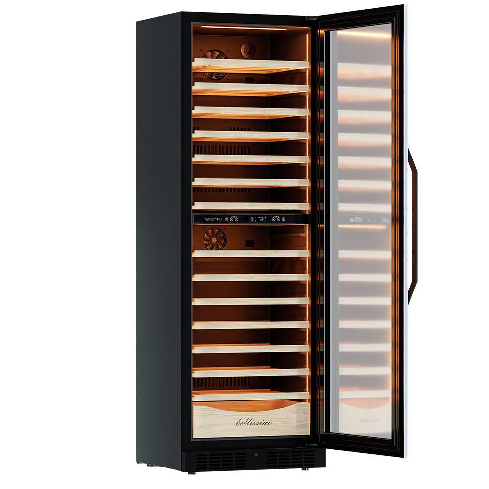 Несомненно, Вас порадует наличие панорамного светодиодного освещения (подсвечивает каждую полку), которое имеет три цвета - белый, янтарный и синий. Оно не выделяет тепло и следовательно - не нагревает бутылки с вином. Так что Вы сможете эффектно демонстрировать Вашу винную коллекцию.