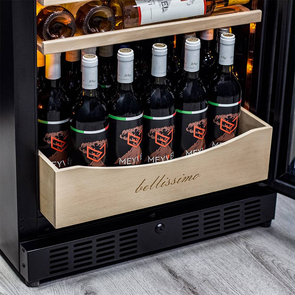 Полки выполнены из массива бука. Этот натуральный и крепкий материал не только имеет красивую текстуру, но и прекрасно гасит небольшую вибрацию. Так что Ваше вино будет храниться в абсолютном покое.