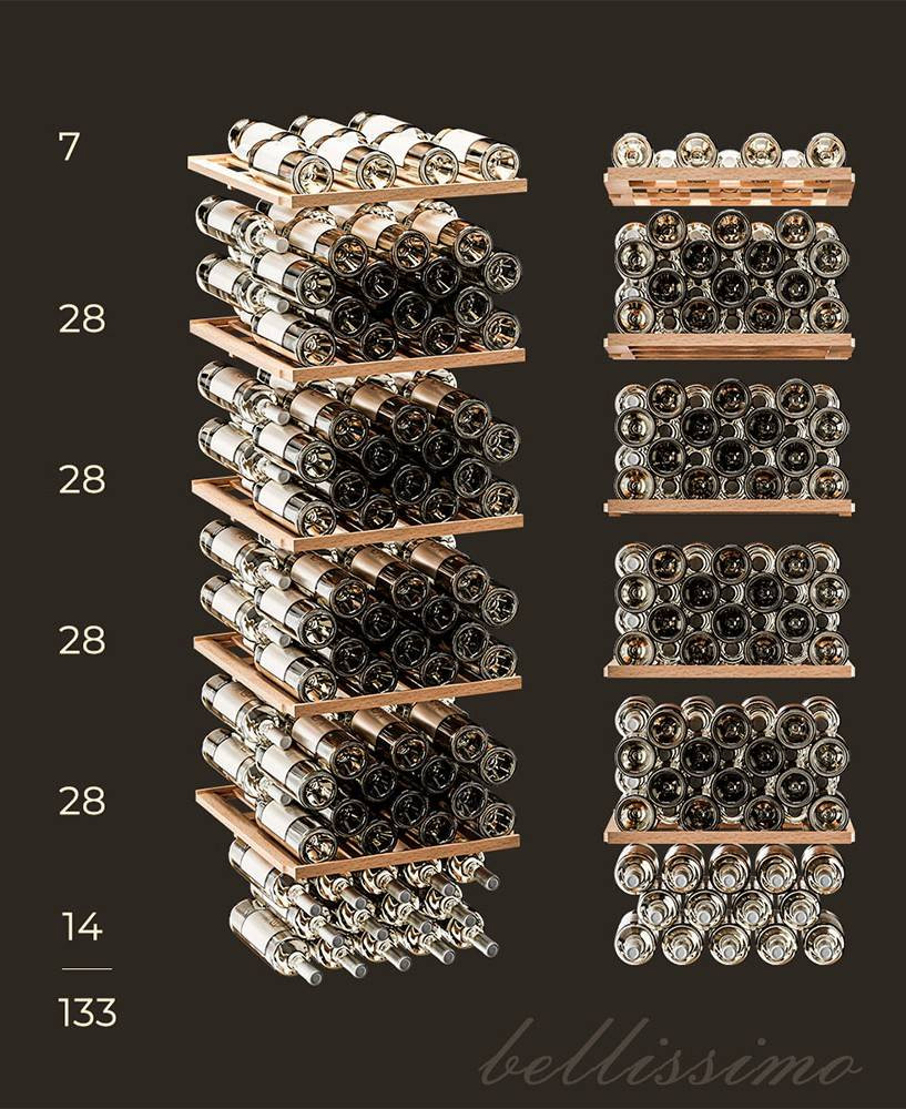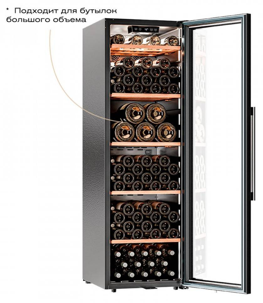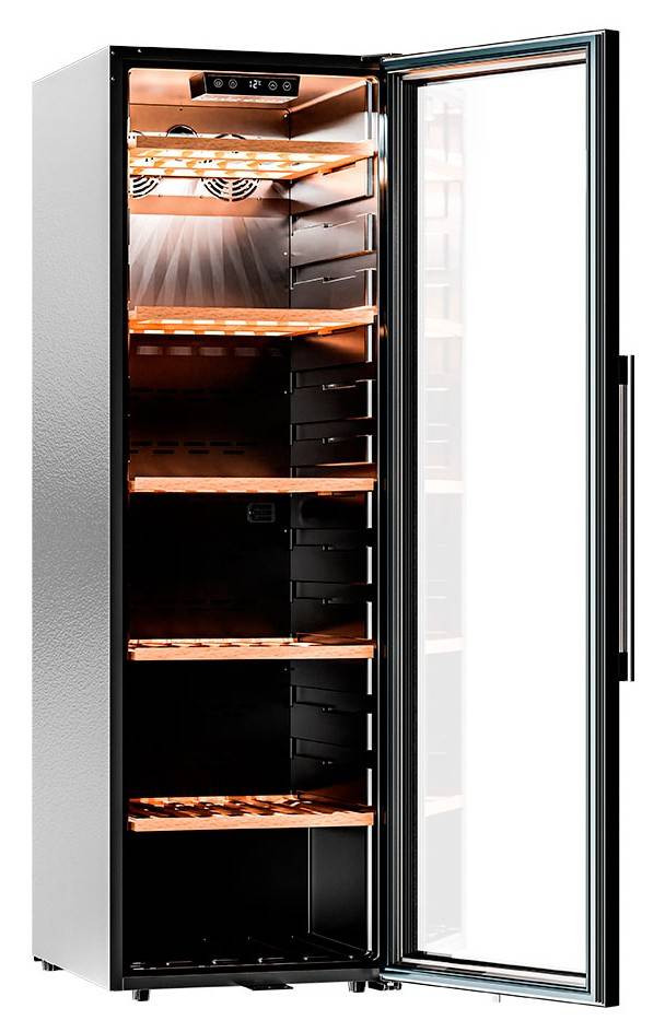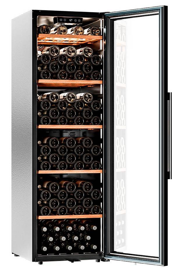 Модель оснащена пятью деревянными полками, которые не только выглядят стильно, но и способствуют правильной циркуляции воздуха внутри шкафа. Тройное стекло с УФ-фильтром надёжно защищает вино от вредного воздействия света, сохраняя его уникальный вкус и аромат.