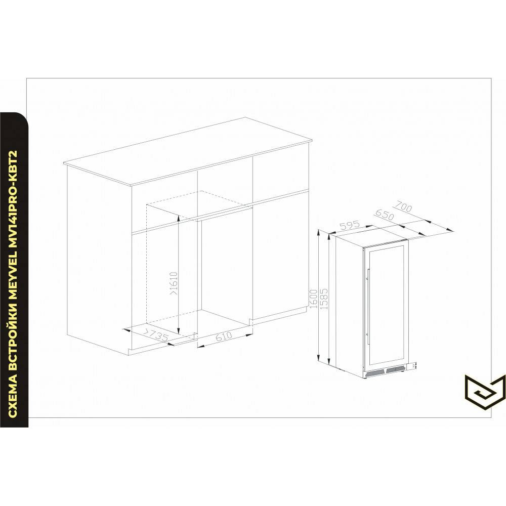 MV141PRO-KBT2 может устанавливаться как отдельно, так и встраиваться в нишу. За счёт того, что верхняя петля двери не выступает за пределы корпуса и шкаф оснащён встроенной системой вентиляции - эта модель устанавливается в нишу с минимальными зазорами.