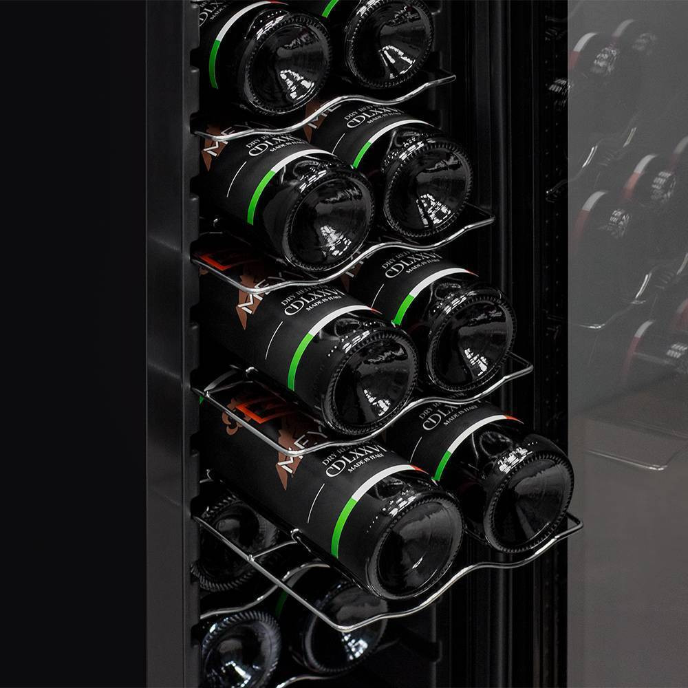 Шкаф имеет в комплекте 7 металлических полок и одну демонстрационную полку, которая позволить сразу же обращать внимание на этикетку нужных вам сортов вина. Общая вместимостью до 16 бутылок типа "Бордо". Полки выполнены из хромированного металла, что обеспечивает их прочность.