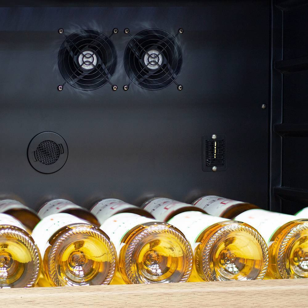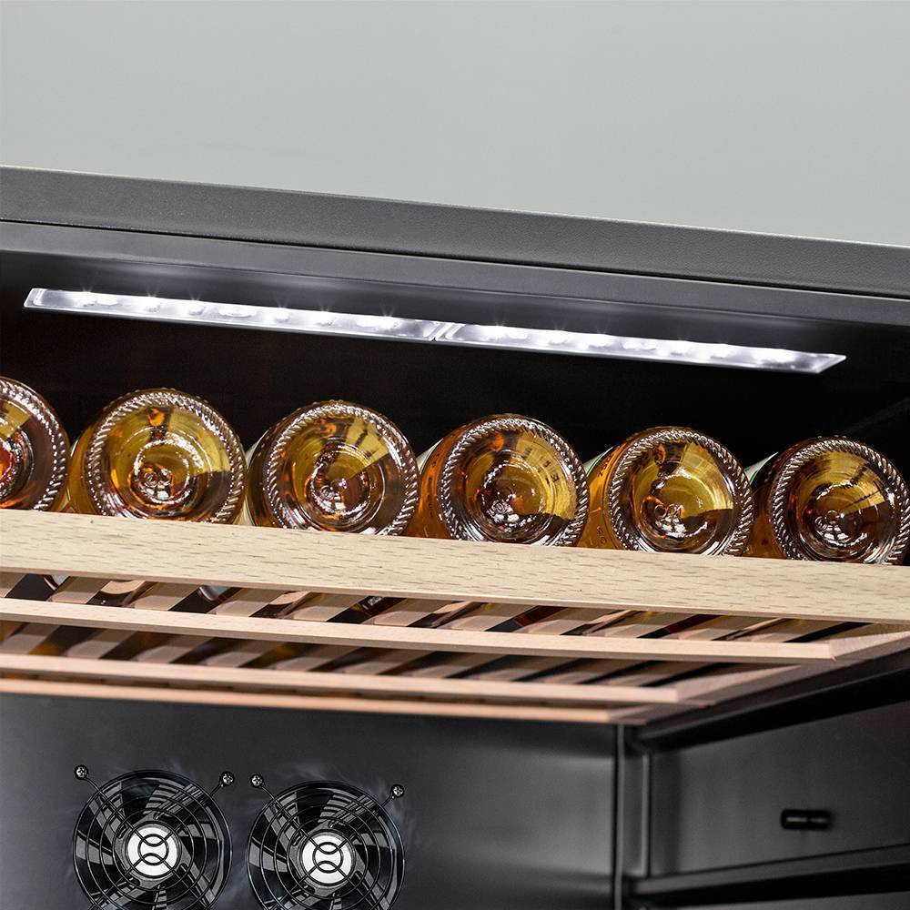 Компрессорный винный шкаф Meyvel MV160-KST2 обладает большой вместимостью и способен разместить до 160 бутылок. Располагаются они на полках из массива бука. Внутреннее пространство шкафа разделено на 2 температурные зоны с возможностью настраивать каждую из них: диапазон нижней зоны от +10°C до +18°C, а верхней - от + 5°C до +10°C. Холодильник поддерживает влажность в диапазоне 60-80%, как в настоящем винном погребе.