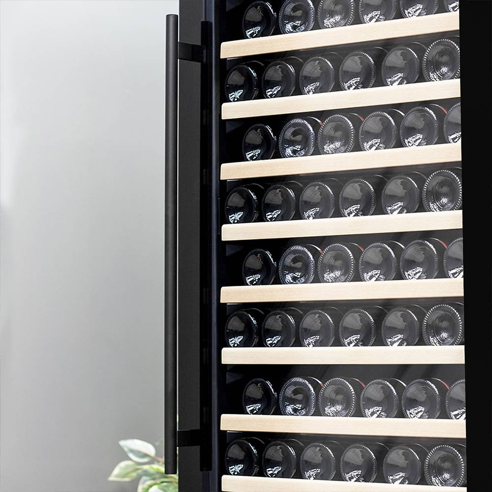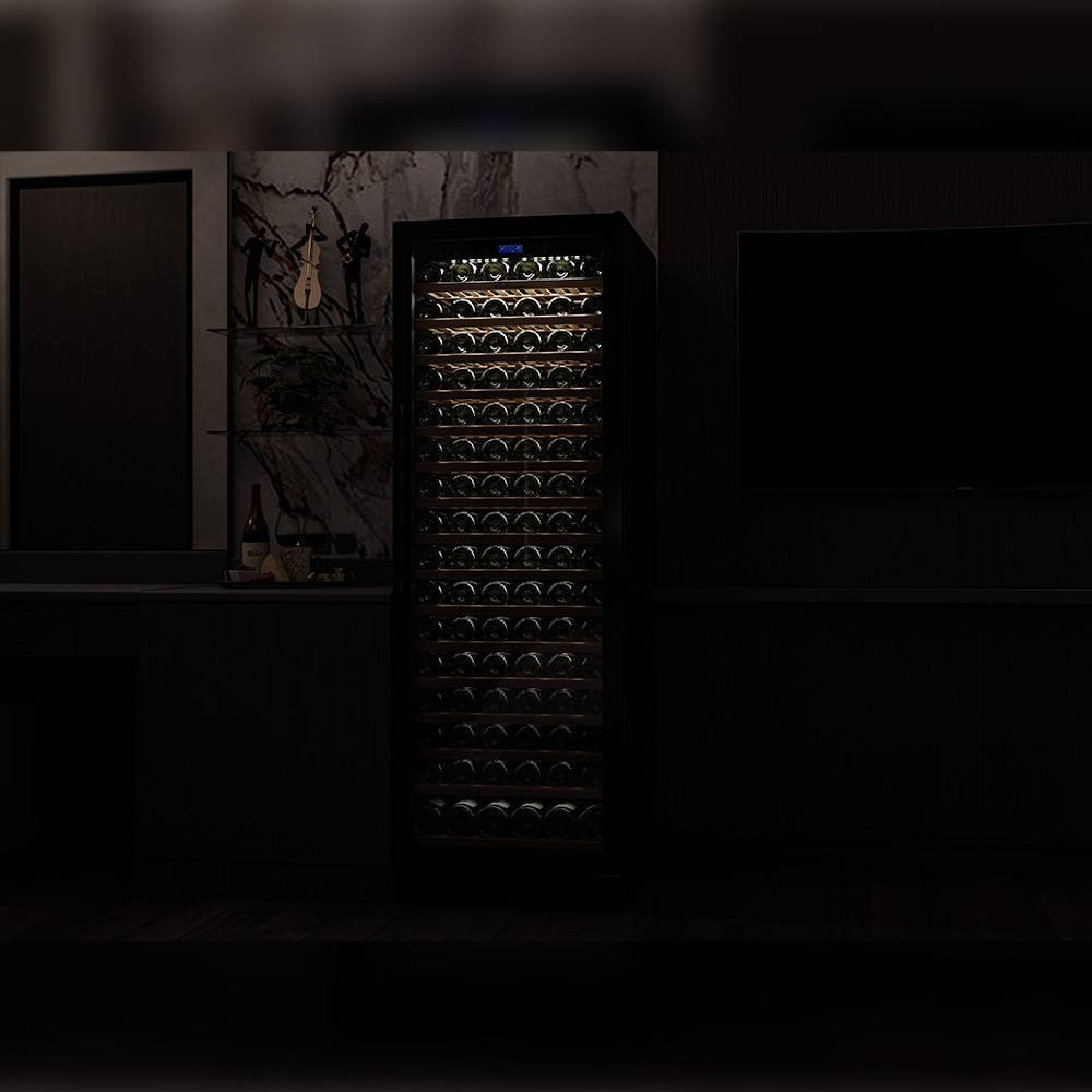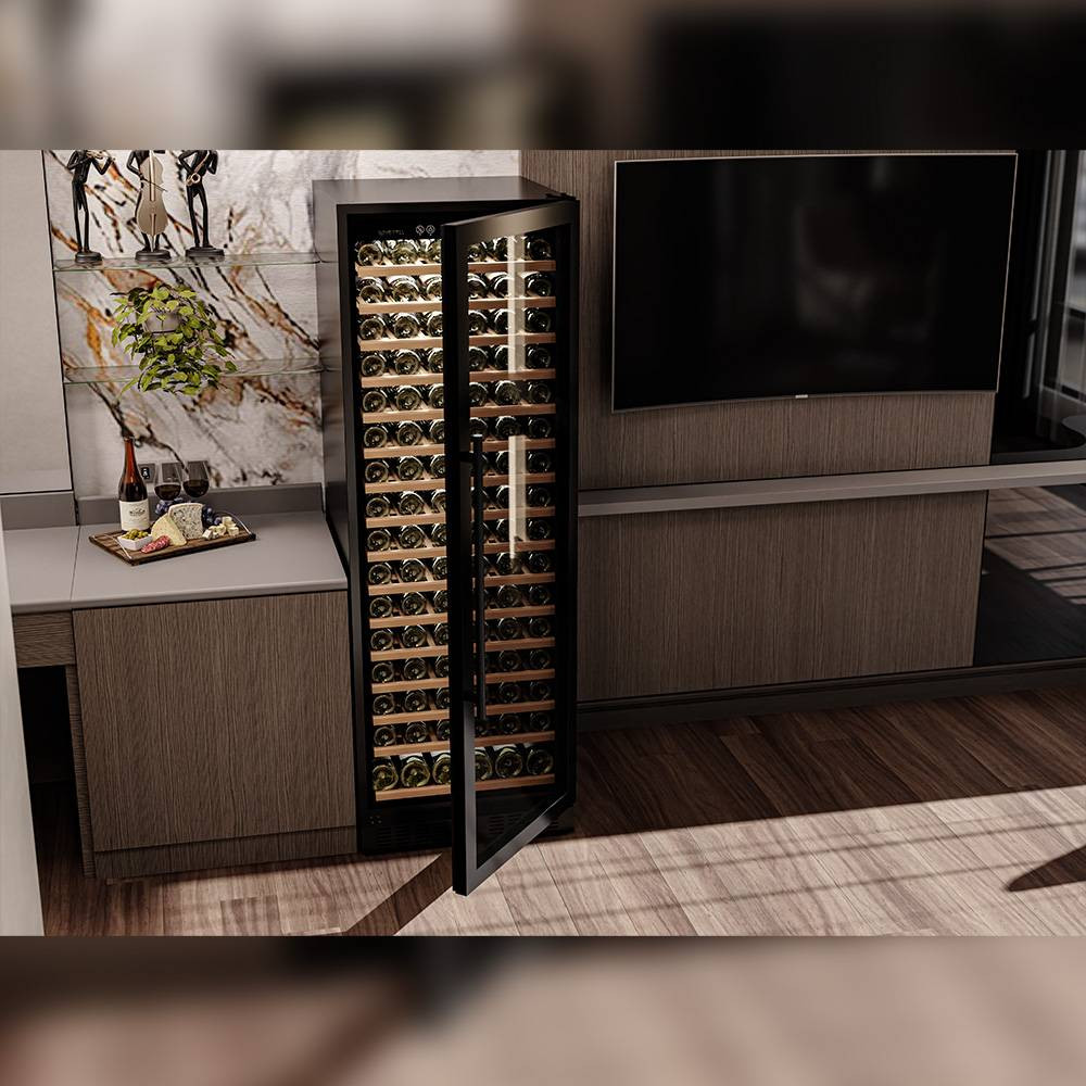 Шкаф имеет в комплекте 15 полок вместимостью до 12 бутылок типа «Бордо» и одну полку с увеличенным пространством на 6 бутылок типа «Магнум», что позволяет вам использовать шкаф для длительного хранения обширной коллекции вин вплоть до 186 бутылок.