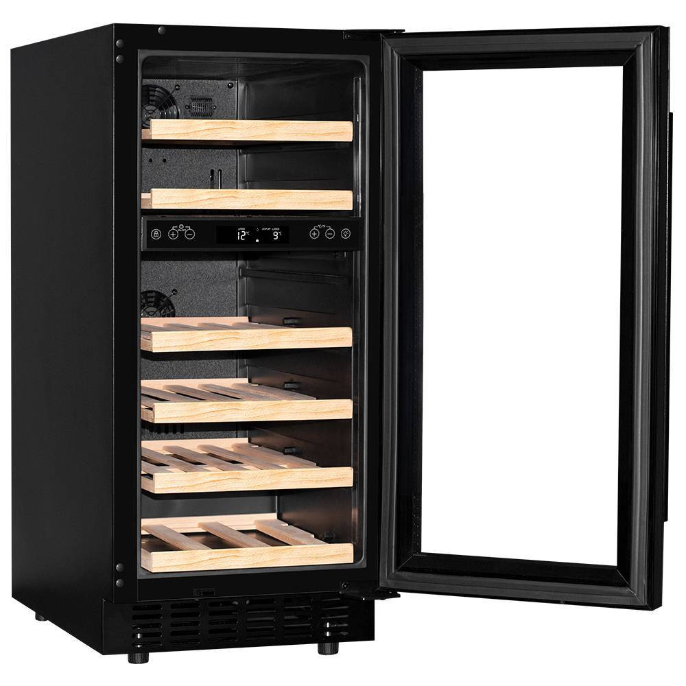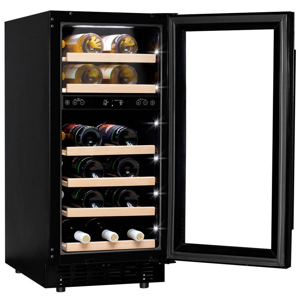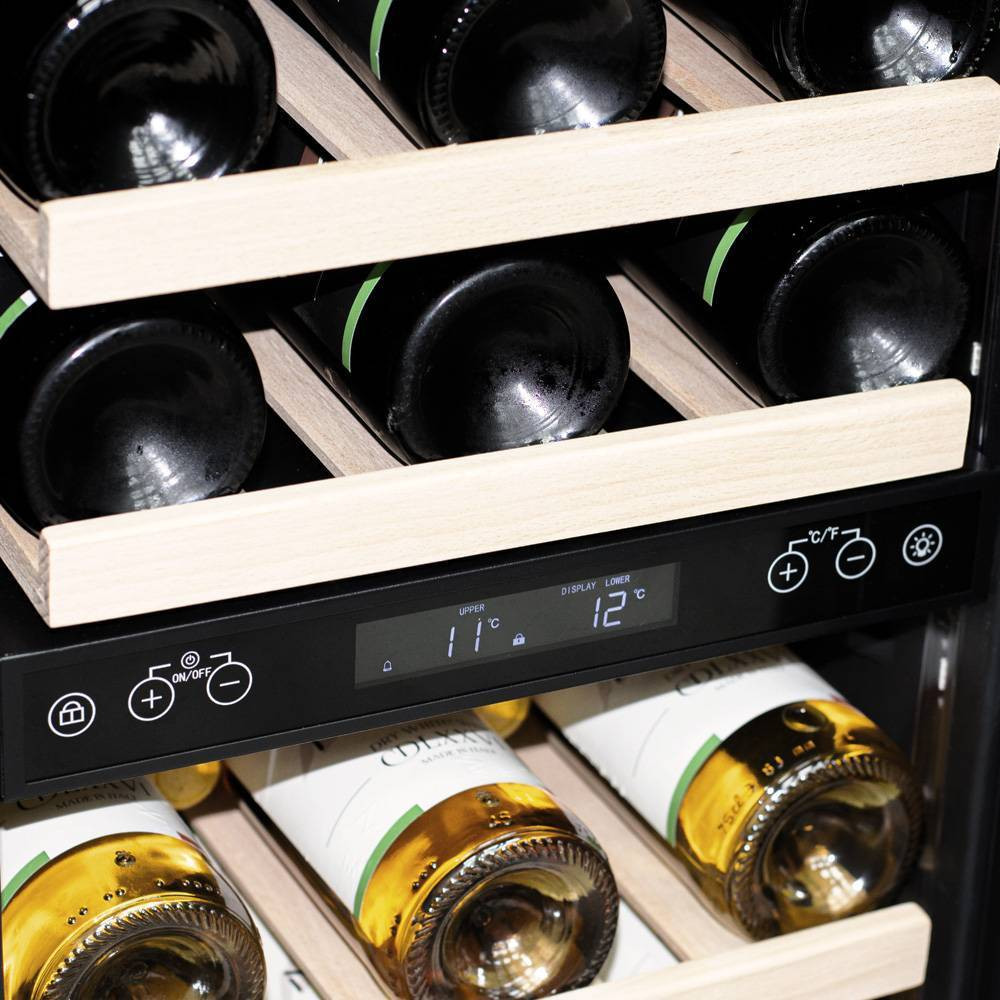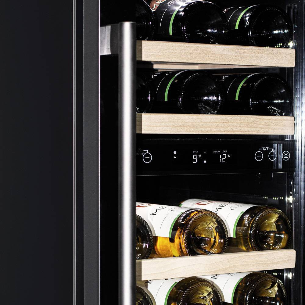 Компрессорный винный шкаф Meyvel MV28-KBT2 обладает большой вместимостью и даёт возможность разместить до 28 бутылок стандартного типа Бордо (0,75 л). Располагаются они на выдвижных полках из дерева. Внутреннее пространство шкафа разделено на 2 температурные зоны, с возможностью настраивать каждую из них. Общий диапазон температуры у данной модели от +5°C до +20°C.