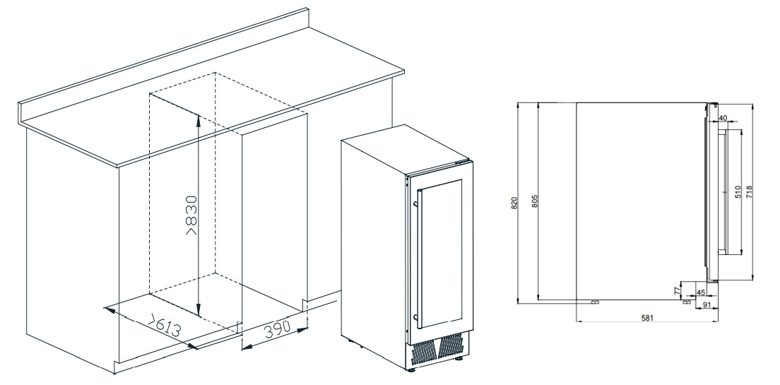необходимо установить винный шкаф по уровню и отрегулировать зазоры между дверью и мебельным фасадом, чтобы не повредить их.