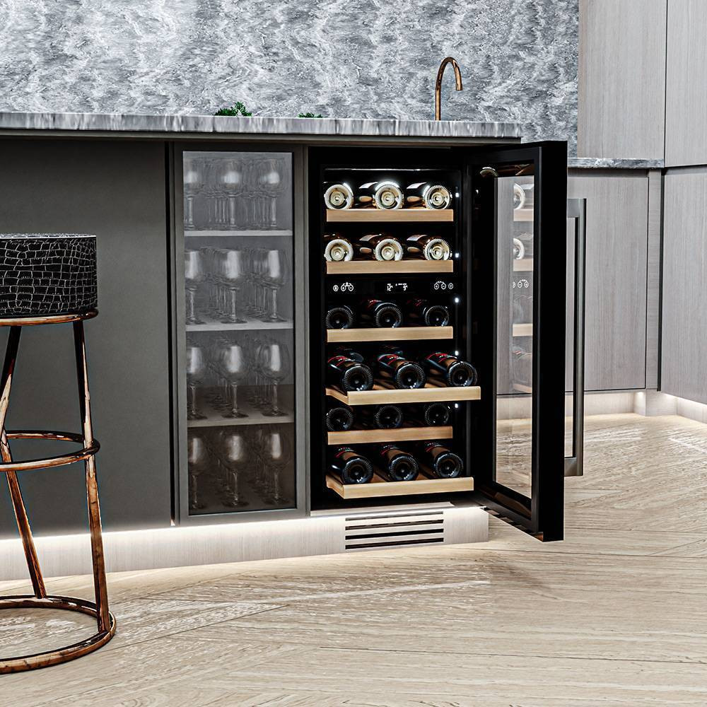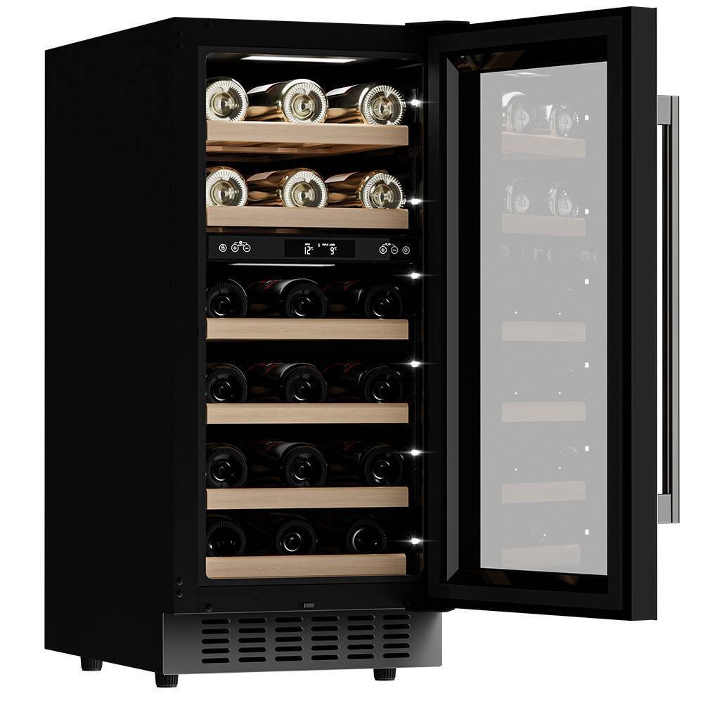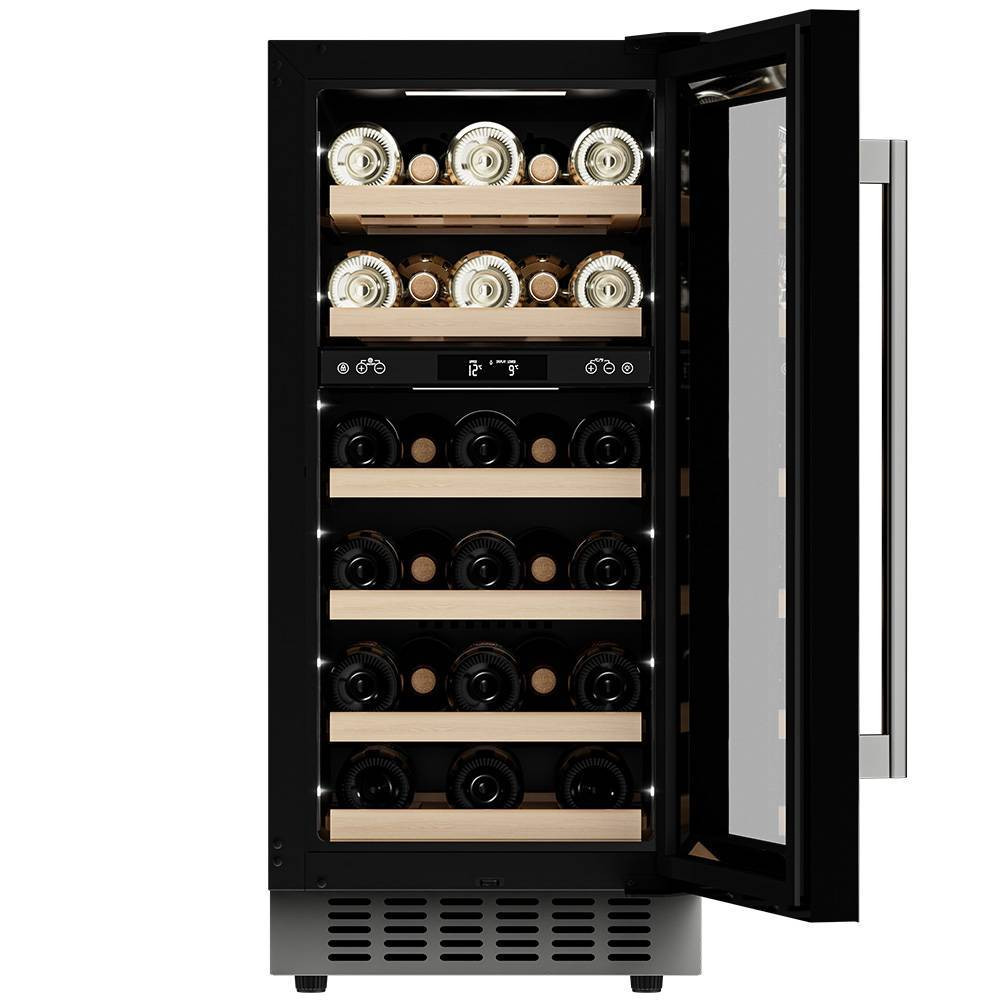 Компрессорный винный шкаф Meyvel MV28-KST2 обладает большой вместимостью и даёт возможность разместить до 28 бутылок стандартного типа Бордо (0,75 л). Располагаются они на выдвижных полках из дерева. Внутреннее пространство шкафа разделено на 2 температурные зоны, с возможностью настраивать каждую из них. Общий диапазон температуры у данной модели от +5°C до +20°C.