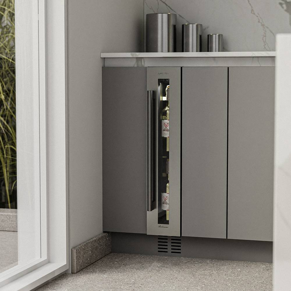 Компрессорный винный шкаф Meyvel MV9 несмотря на небольшой размер, обладает большой вместимостью и дает возможность разместить до 9 бутылок. Располагаются они на держателях из массива бука. Внутреннее пространство шкафа поддерживает комфортную для вина температуру от +5℃ до +20℃ и имеет самую большую вместимость среди аналогичных винных шкафов. Преимуществом этой модели является возможность разместить внутри одну высокую бутылку. Так же, MV9 данная модель поддерживает влажность в диапазоне 60-80%, как в настоящем винном погребе.