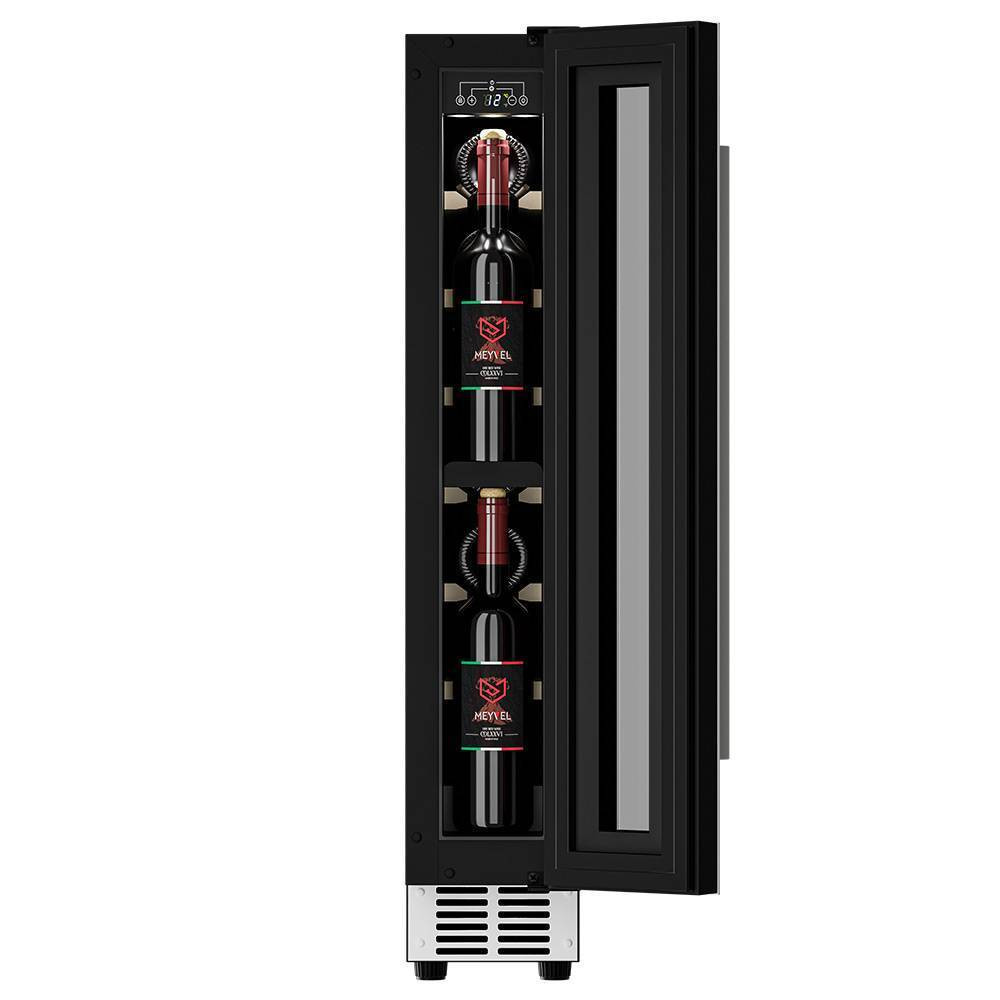 Компрессорный винный шкаф Meyvel MV9 несмотря на небольшой размер, обладает большой вместимостью и дает возможность разместить до 9 бутылок. Располагаются они на держателях из массива бука. Внутреннее пространство шкафа поддерживает комфортную для вина температуру от +5℃ до +20℃ и имеет самую большую вместимость среди аналогичных винных шкафов. Преимуществом этой модели является возможность разместить внутри одну высокую бутылку. Так же, MV9 данная модель поддерживает влажность в диапазоне 60-80%, как в настоящем винном погребе.