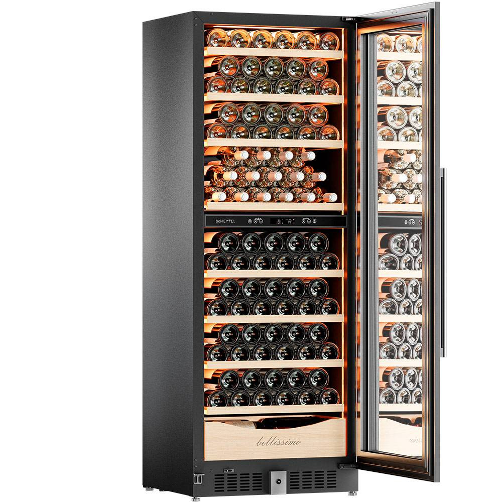 Несомненно, Вас порадует наличие панорамного светодиодного освещения (подсвечивает каждую полку), которое имеет три цвета - белый, янтарный и синий. Оно не выделяет тепло и следовательно - не нагревает бутылки с вином. Так что Вы сможете эффектно демонстрировать Вашу винную коллекцию.