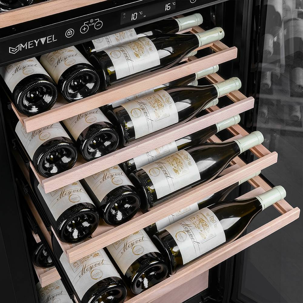 Благодаря увеличенному расстоянию между полками, общая вместимость винного шкафа больше, чем у аналогичных моделей, и на любой полке вы сможете разместить нестандартные бутылки, например «Магнум».