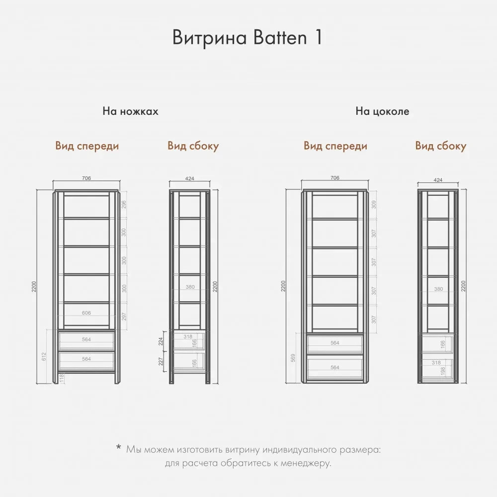 Вы можете заказать витрину в одной из 6 стандартных тонировок древесины. Для выбора ознакомьтесь с предлагаемыми вариантами. Так же вы можете заказать витрину в индивидуальном размере.