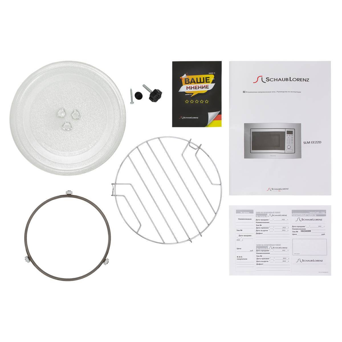 В комплекте: стеклянный поднос, роликовая подставка, инструкция, гарантийный талон и решетка для гриля.