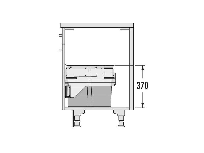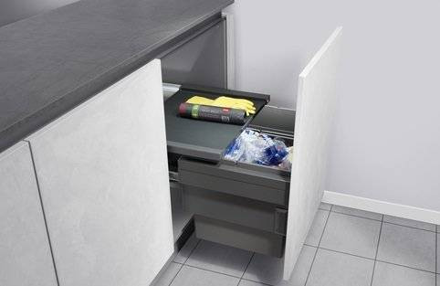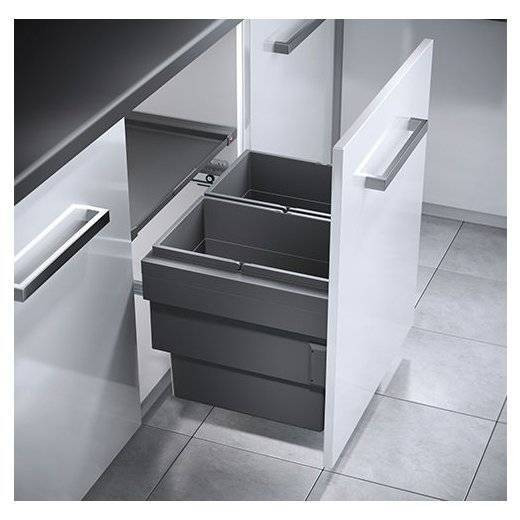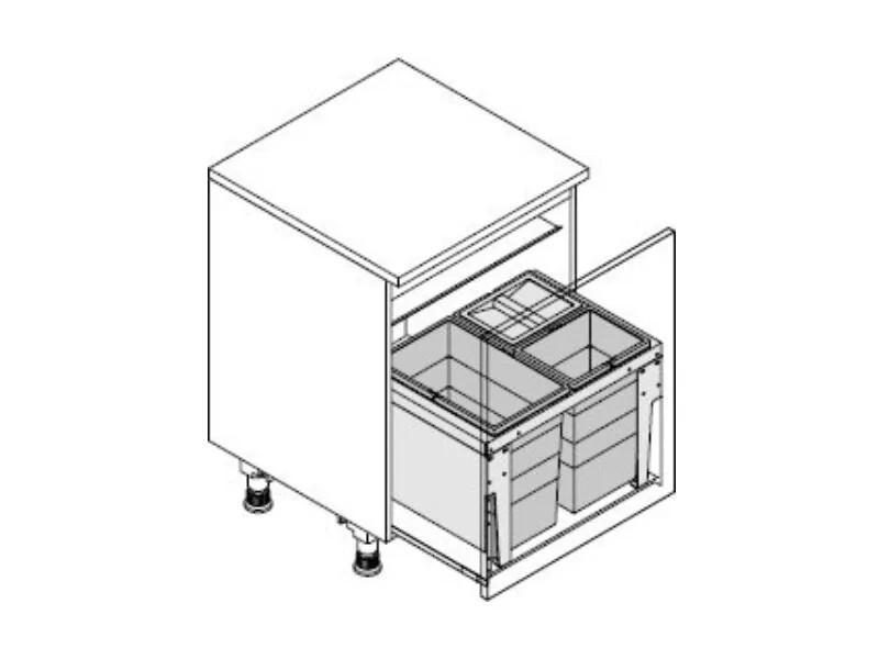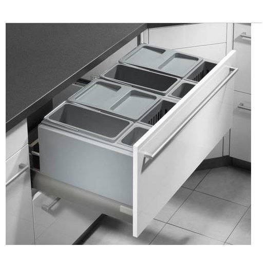 Комплектация: рама с креплением ко дну шкафа и высокому фасаду, 2 ведра по 13л, ведро 28л, плотная крышка для ведра 13л, стационарная крышка из металла, комплект для крепежа.