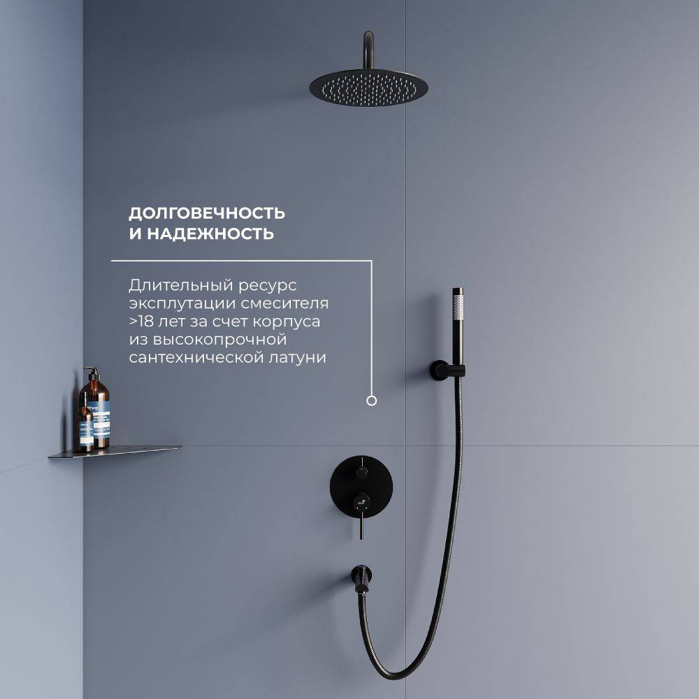 Встраиваемая душевая система выполнена из латуни и нержавеющей стали, что придаёт изделию повышенную устойчивость к образованию коррозии и ржавчины, а внутренний элемент оснащён керамическими пластинами. За счет применения передовых технологий душевые системы рассчитаны на ресурс эксплуатации не менее 10 лет.