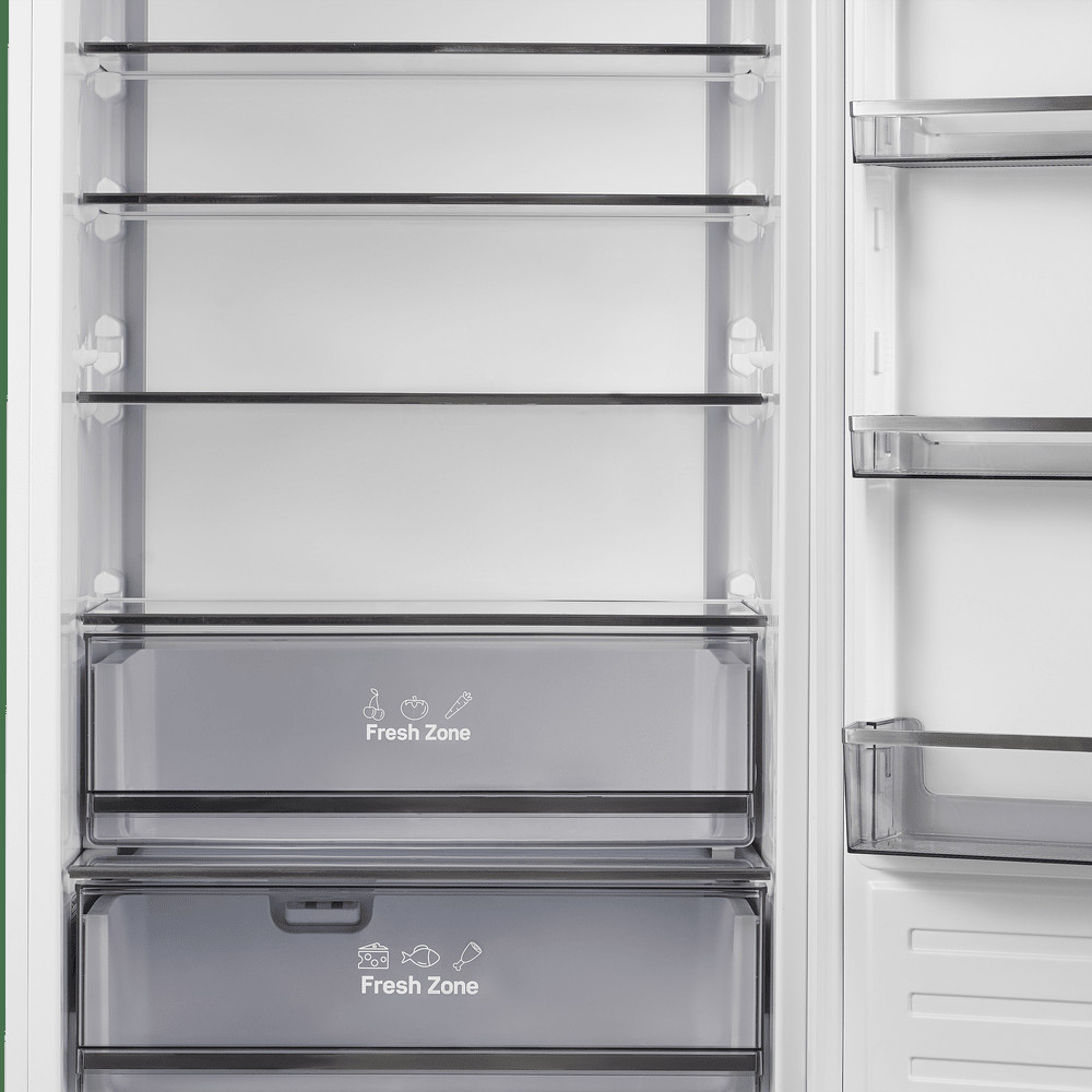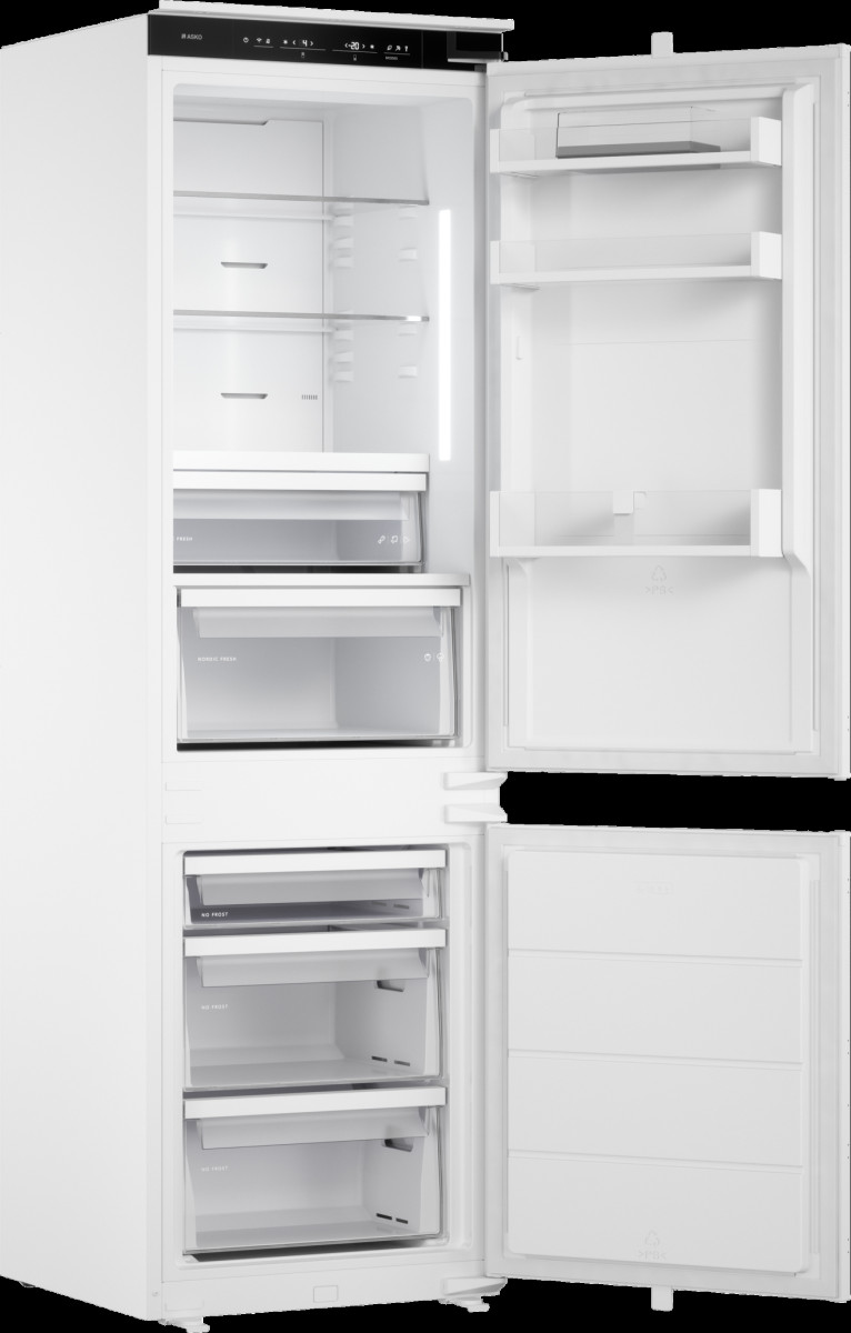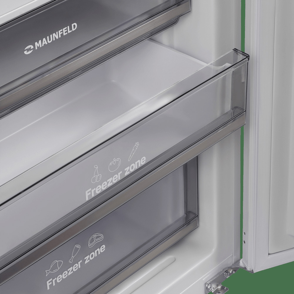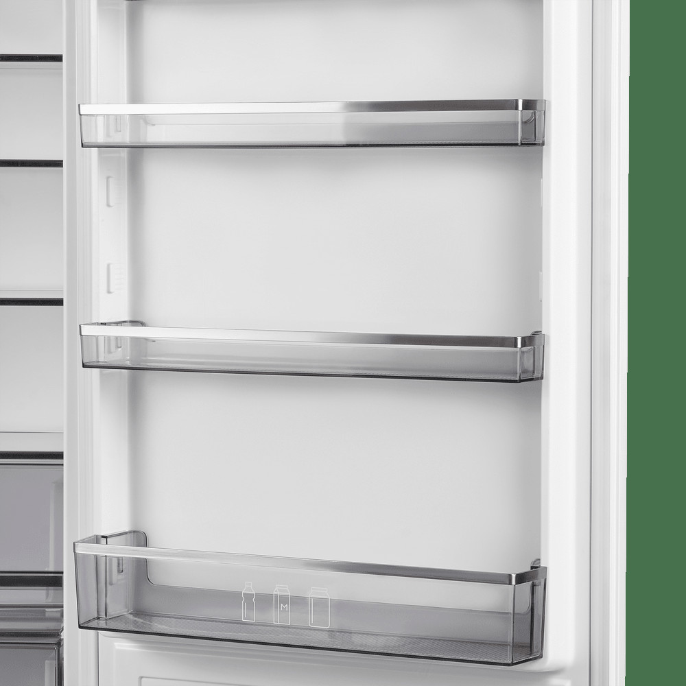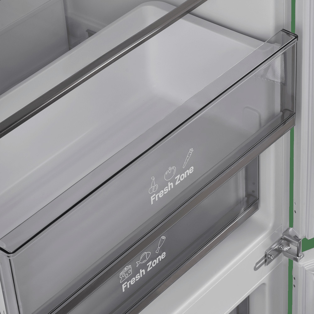 Внутри — 199 литра полезного объёма: 142 л отведено под холодильную камеру, а 57 л — под нижнюю морозилку с тремя отсеками и двумя выдвижными ящиками. Это удобно для хранения как повседневных продуктов, так и замороженных запасов. В холодильной зоне — три прочные стеклянные полки, три секции на дверце и отдельная полка под бутылки, что упрощает сортировку. Для овощей и фруктов предусмотрена специальная зона DuraFresh, автоматически поддерживающая оптимальную влажность и температуру. Технология NoFrost в паре с системой Opti flow+ обеспечивает равномерное распределение холода и полностью исключает образование инея в морозильной камере, избавляя от ручной разморозки.