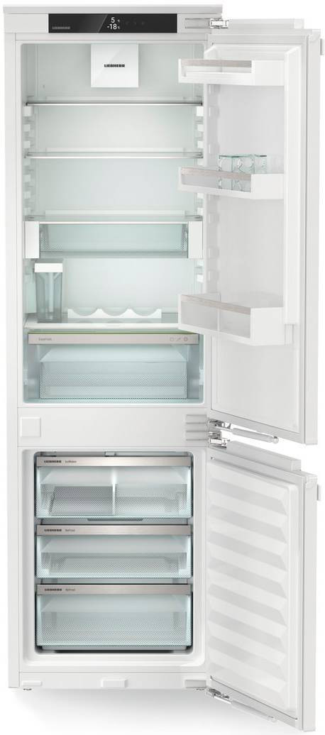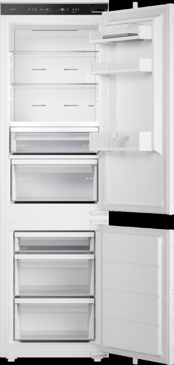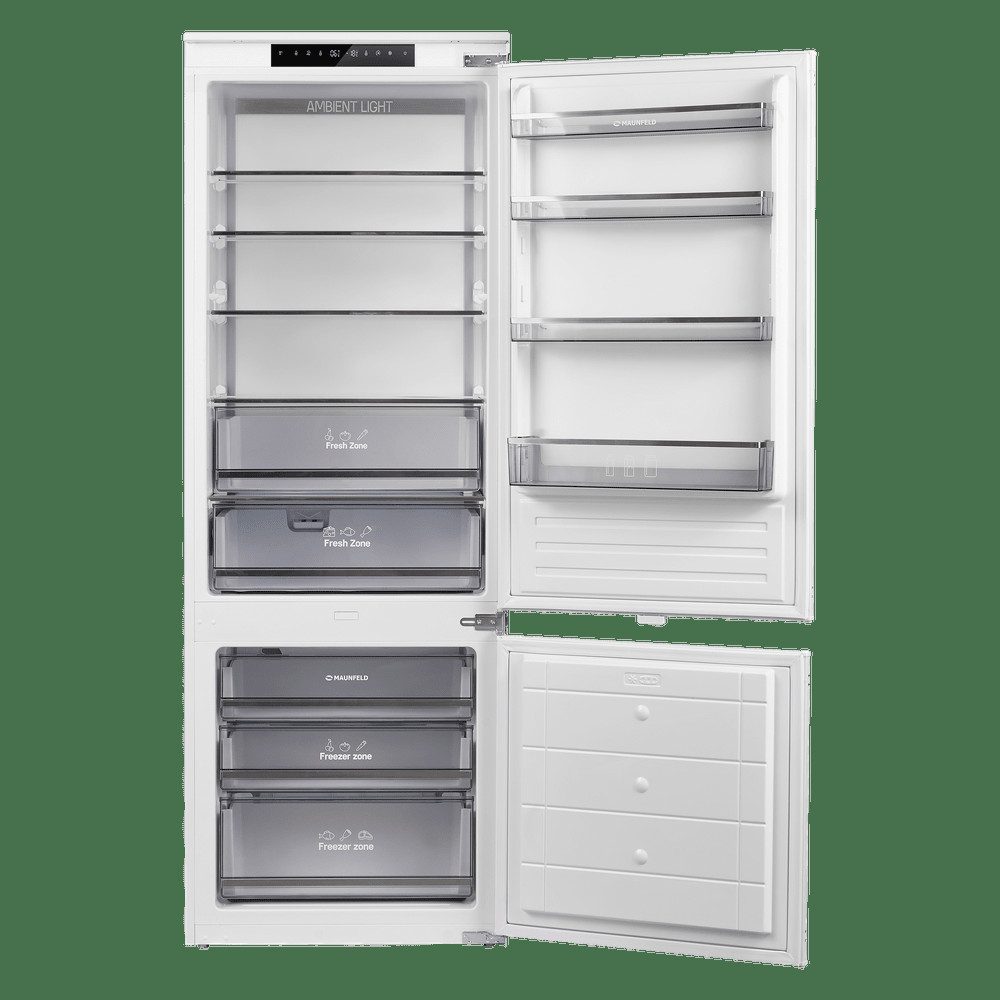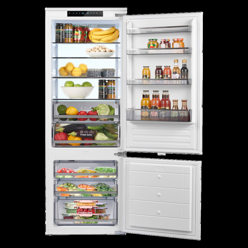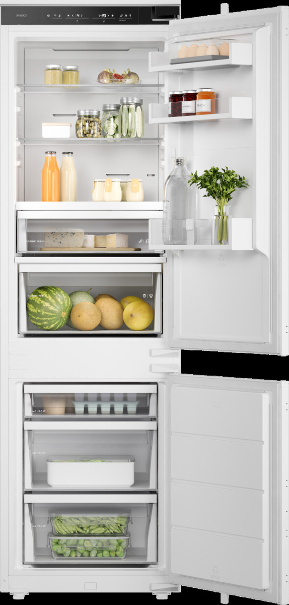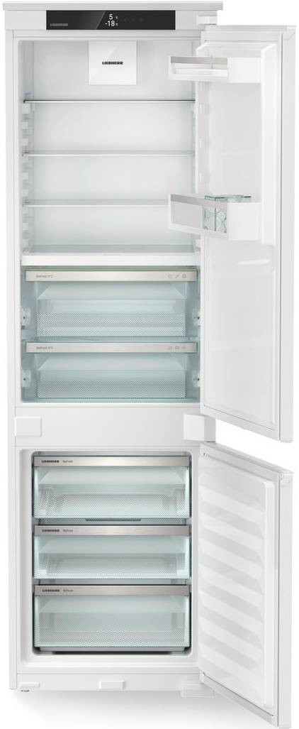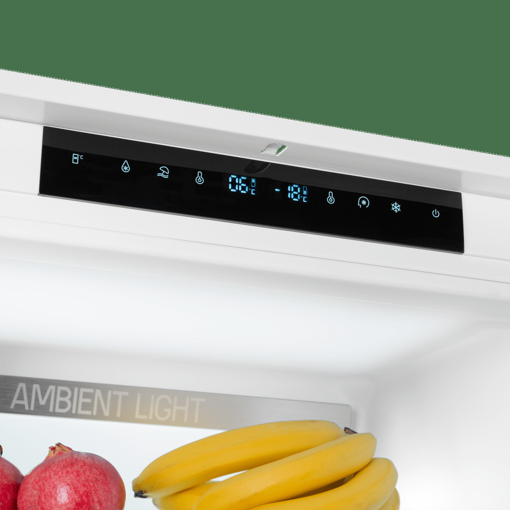 Внутри — 199 литра полезного объёма: 142 л отведено под холодильную камеру, а 57 л — под нижнюю морозилку с тремя отсеками и двумя выдвижными ящиками. Это удобно для хранения как повседневных продуктов, так и замороженных запасов. В холодильной зоне — три прочные стеклянные полки, три секции на дверце и отдельная полка под бутылки, что упрощает сортировку. Для овощей и фруктов предусмотрена специальная зона DuraFresh, автоматически поддерживающая оптимальную влажность и температуру. Технология NoFrost в паре с системой Opti flow+ обеспечивает равномерное распределение холода и полностью исключает образование инея в морозильной камере, избавляя от ручной разморозки.