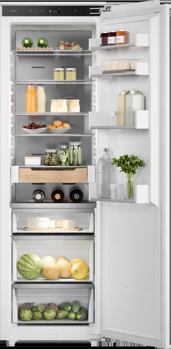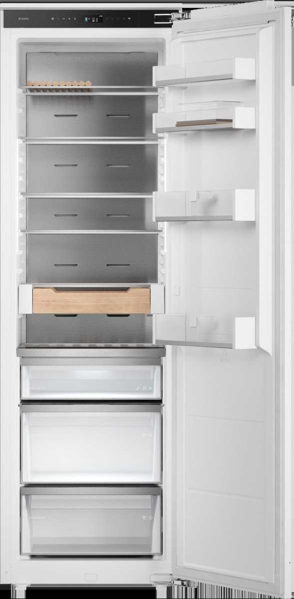 Внутри — 245 литров полезного объёма, чего хватит даже для крупной семьи. Пространство организовано логично: шесть прочных стеклянных полок, четыре секции на дверце, три выдвижных ящика, отдельная полка для бутылок и держатель для яиц — всё это помогает поддерживать порядок без постоянной перестановки. Зона DuraFresh предназначена для хранения овощей, фруктов и мяса при оптимальной влажности и температуре, продлевая их свежесть. Система Opti flow+ с вентилятором равномерно распределяет холод по всему объёму, а адаптивный контроль автоматически корректирует режимы в зависимости от загрузки. Функция Super Cool быстро снижает температуру после внесения свежих покупок — особенно полезна после крупного шопинга.