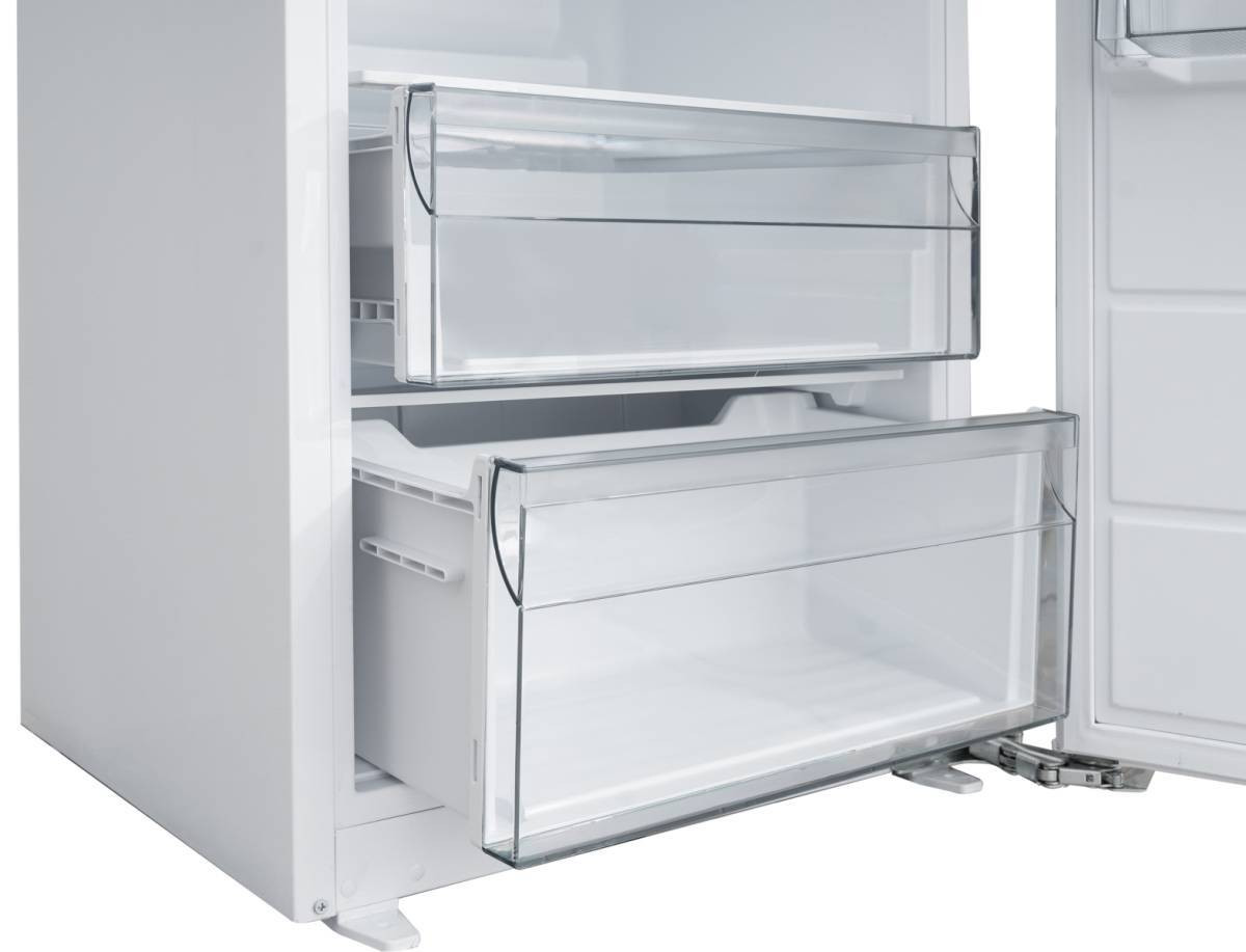 Большой объём и функциональность: холодильная камера наполнена пятью прочными полками из закаленного стекла и двумя пластиковыми ящиками для овощей и фруктов, также на дверце находятся пять полок