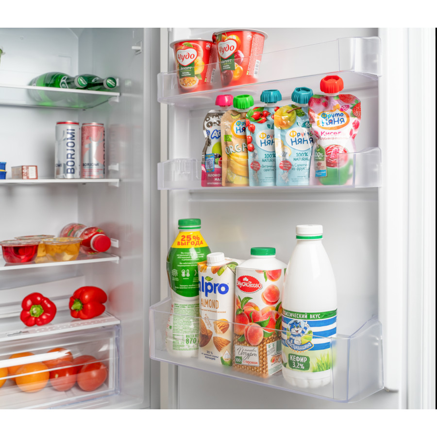 Функциональность: холодильная камера наполнена четырьмя сверхпрочными стеклянными полками, ящиком для овощей и фруктов и четырьмя полками на дверце. В морозильной камере расположены три прозрачных пластиковых ящика