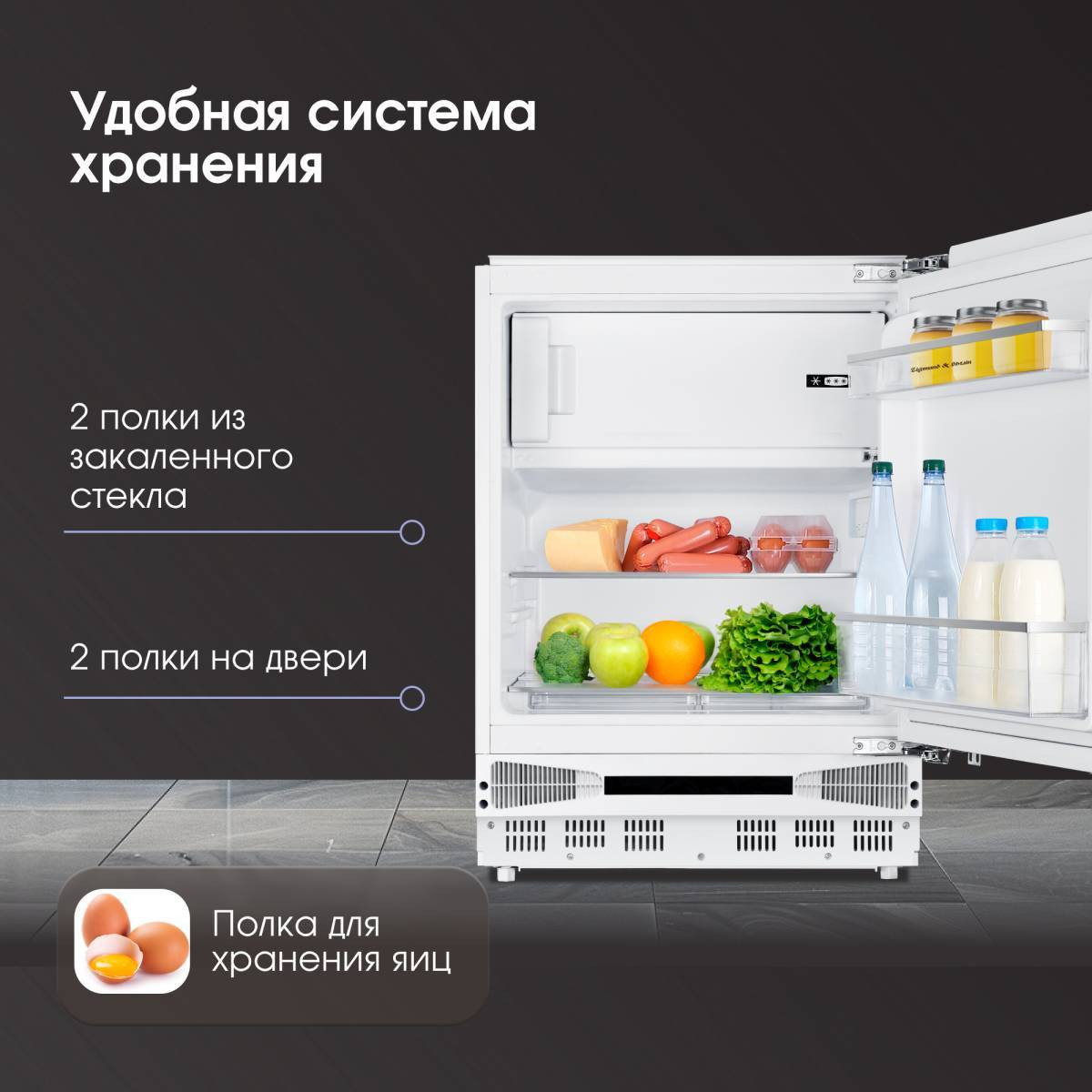 Конструктивные особенности: светодиодное освещение камеры, 2 полки из закаленного стекла в камере, 2 полки на двери, полка для яиц, перевешиваемая дверца