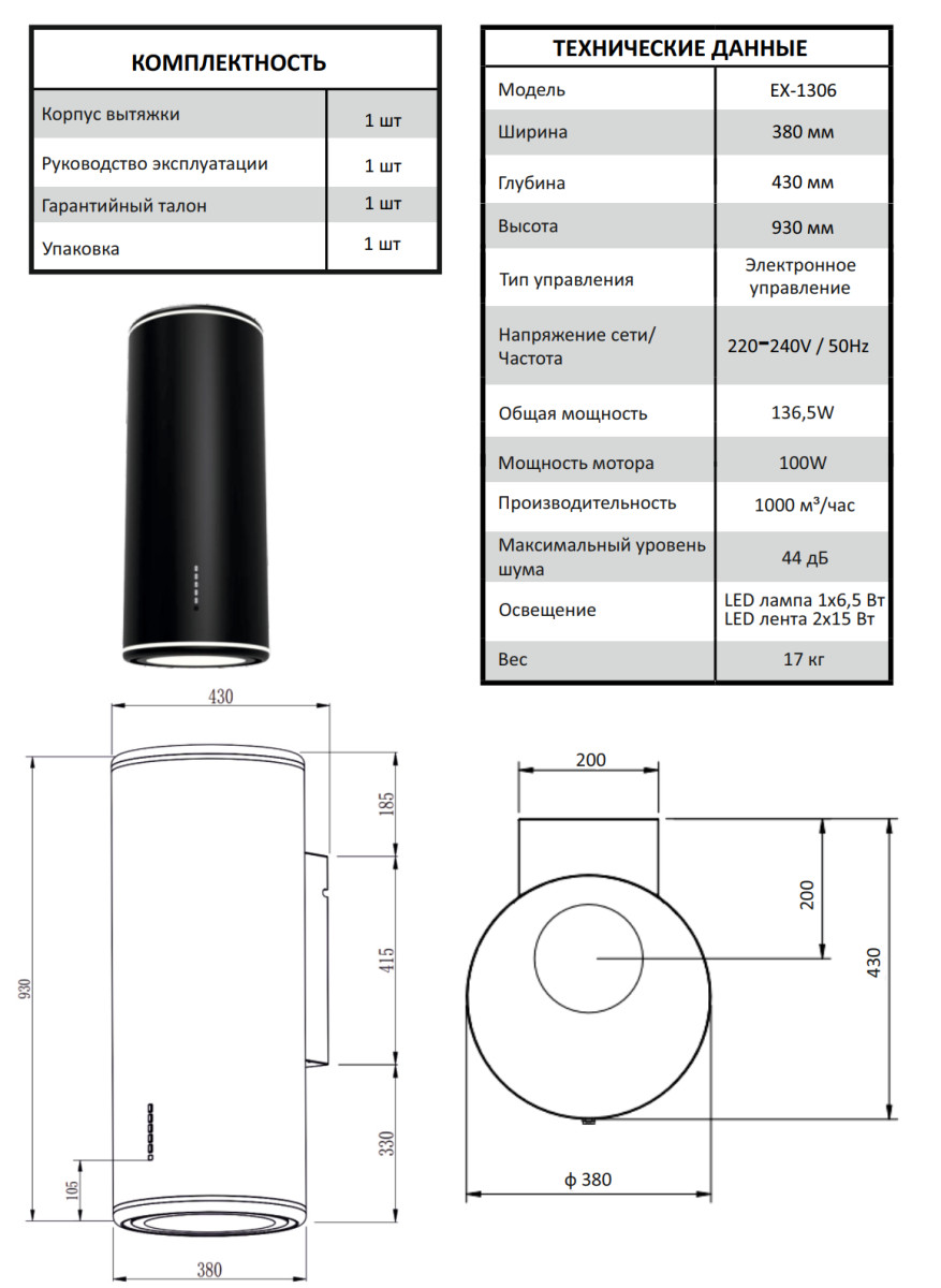 Освещение: LED лампа 1x6.5 Вт, LED лента 2x15 Вт