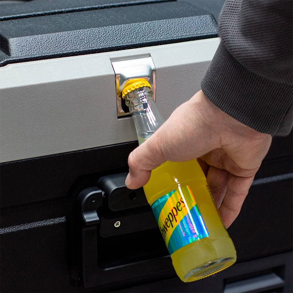 Модель укомплектована многофункциональной дверью-крышкой, дизайн которой даёт возможность использовать её в качестве стола, ставить до четырёх стаканов с напитками в специальные подстаканники. Так же в крышке автохолодильника есть специальные углубления для установки телефонов и планшетов. Любителей рыбалки несомненно порадует наличие на крышке линейки для измерения улова или других трофеев. В качестве бонуса, на корпусе встроена открывалка для бутылок. Благодаря перечисленным особенностям, холодильник идеально подходит для отдыха на природе.
