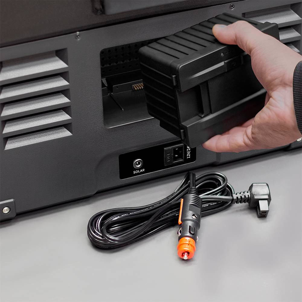 Помимо работы от прикуривателя, к данной модели можно приобрести аккумулятор FSAK-002 (быстросъёмную батарею), что позволит холодильнику работать автономно. Чтобы не беспокоится о внезапной разрядке аккумулятора, например, во время отдыха на природе, к автомобильному холодильнику можно подключить солнечную батарею. Для этого на корпусе есть специальный разъём. Контроллер для зарядки быстросъёмной батареи так же уже встроен в холодильник. При работе автохолодильника от солнечной батареи - быстросъёмная батарея должна быть обязательно установлена.