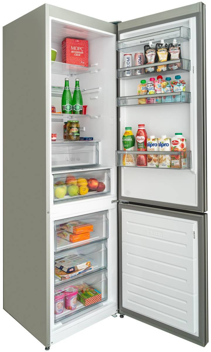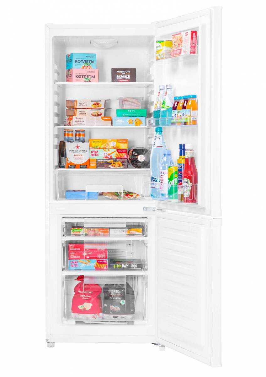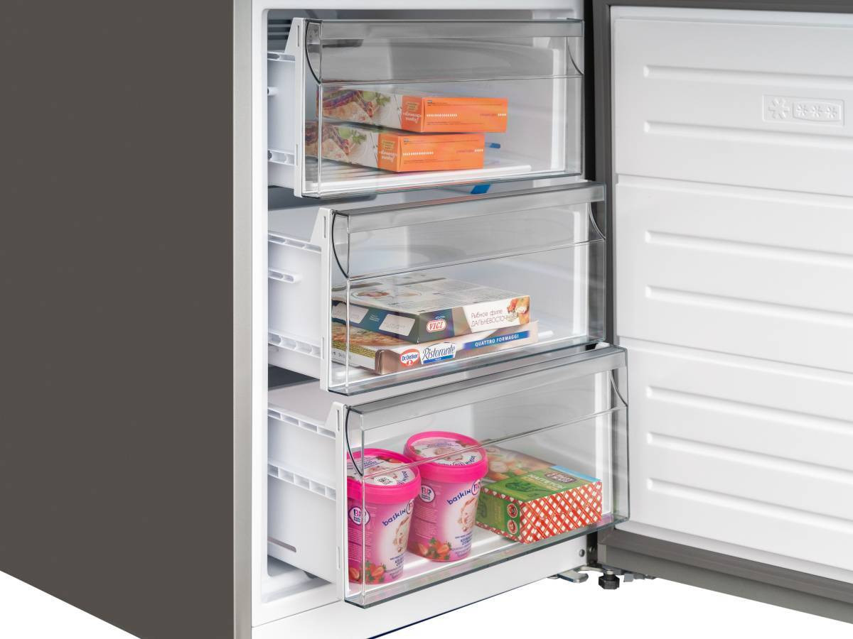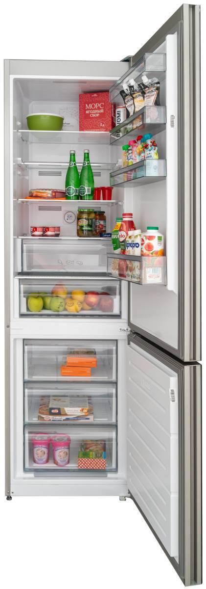 Организация пространства: 3 стеклянные полки, 3 дверные полки, 2 ящика в холодильной камере, 3 пластиковых ящика в морозильной камере