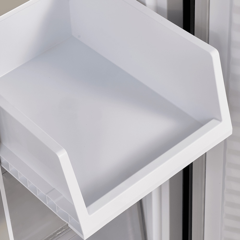 Корпус высотой 183 см имеет ширину 78,5 см и сделан из металла. Две верхние и две нижние двери укомплектованы фасадами из полированного металла. Внутренняя часть выполнена из антибактериального белого пластика легкой очистки.