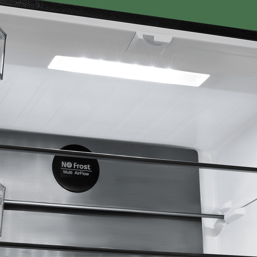 Система охлаждения всех трех камер - «Total No Frost». Это инновационная разработка, при которой холодный сухой воздух равномерно распределяется при помощи вентилятора по всей камере. Благодаря этому на продуктах и внутренних поверхностях прибора не образовывается иней. Теперь вам никогда не придется размораживать холодильник.