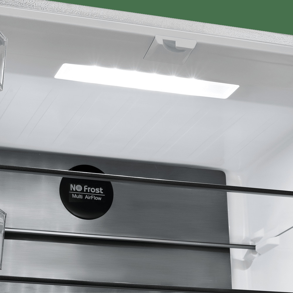 Система охлаждения всех трех камер - «Total No Frost». Это инновационная разработка, при которой холодный сухой воздух равномерно распределяется при помощи вентилятора по всей камере. Благодаря этому на продуктах и внутренних поверхностях прибора не образовывается иней. Теперь вам никогда не придется размораживать холодильник.