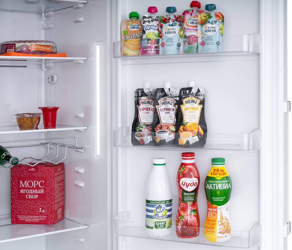 С удобным LED освещением сверху и сбоку будет легко найти продукты в любой части холодильника