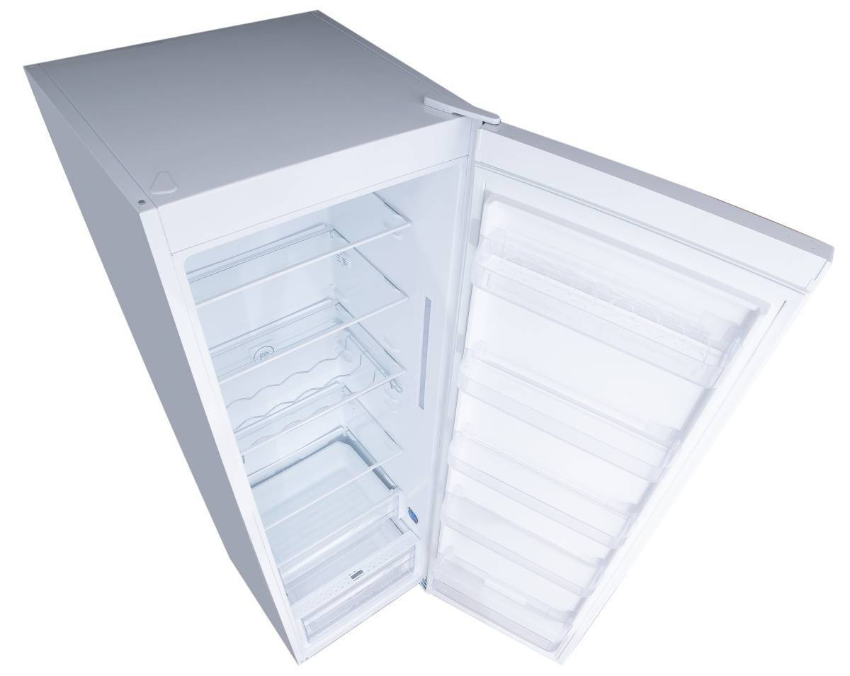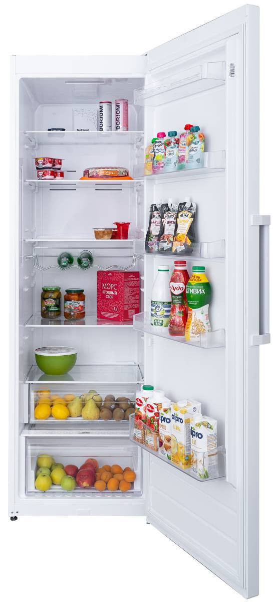 Угол открытия дверей холодильника 120°, ящики и полки полностью вынимаются из холодильника, дверца не мешает