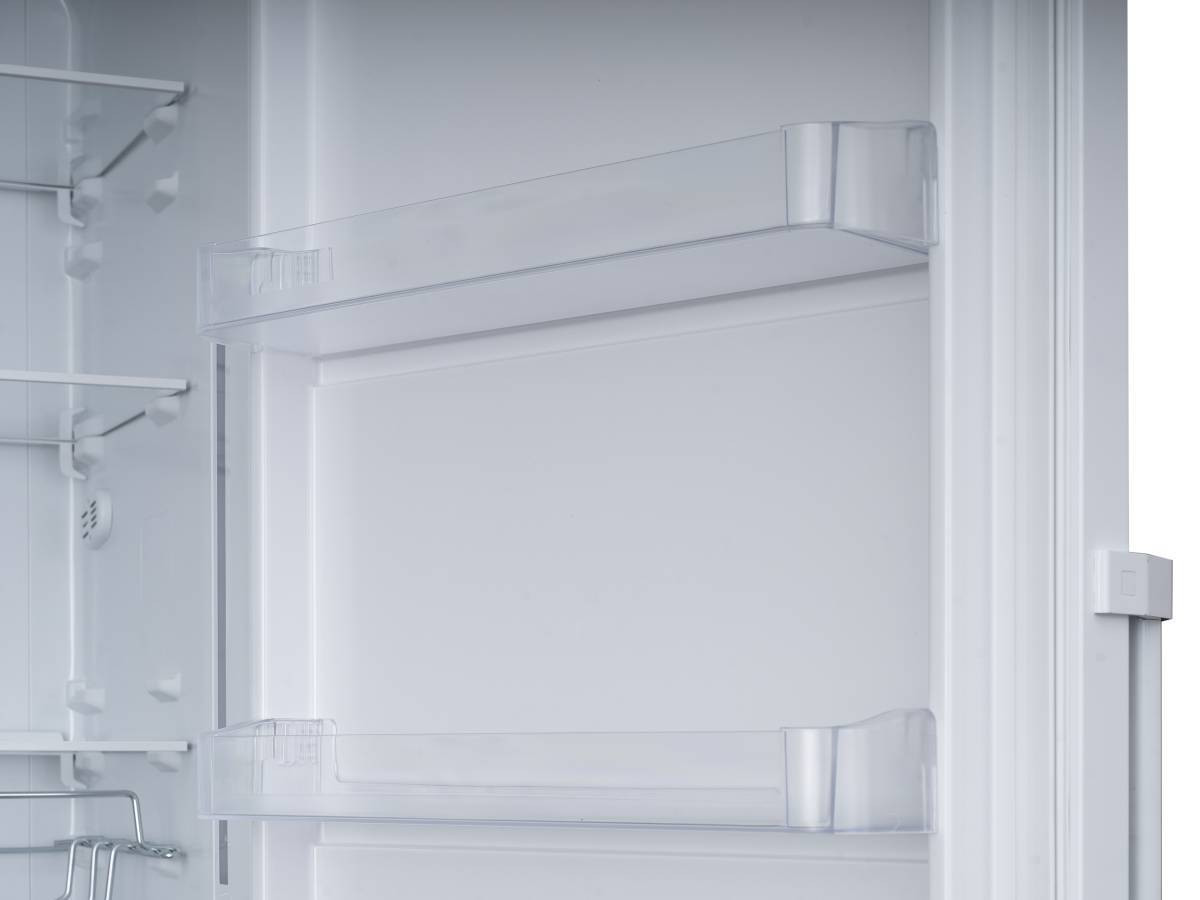 Большой объём и функциональность: холодильная камера наполнена пятью прочными полками из закаленного стекла и двумя пластиковыми ящиками для овощей и фруктов, также на дверце находятся пять полок