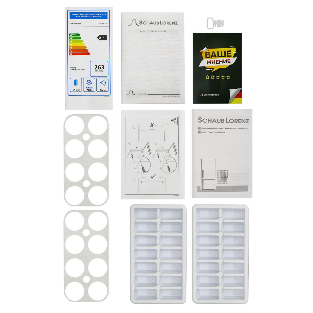 В комплекте идет: лоток для яиц, лоток для льда, инструкция, гарантийный талон.