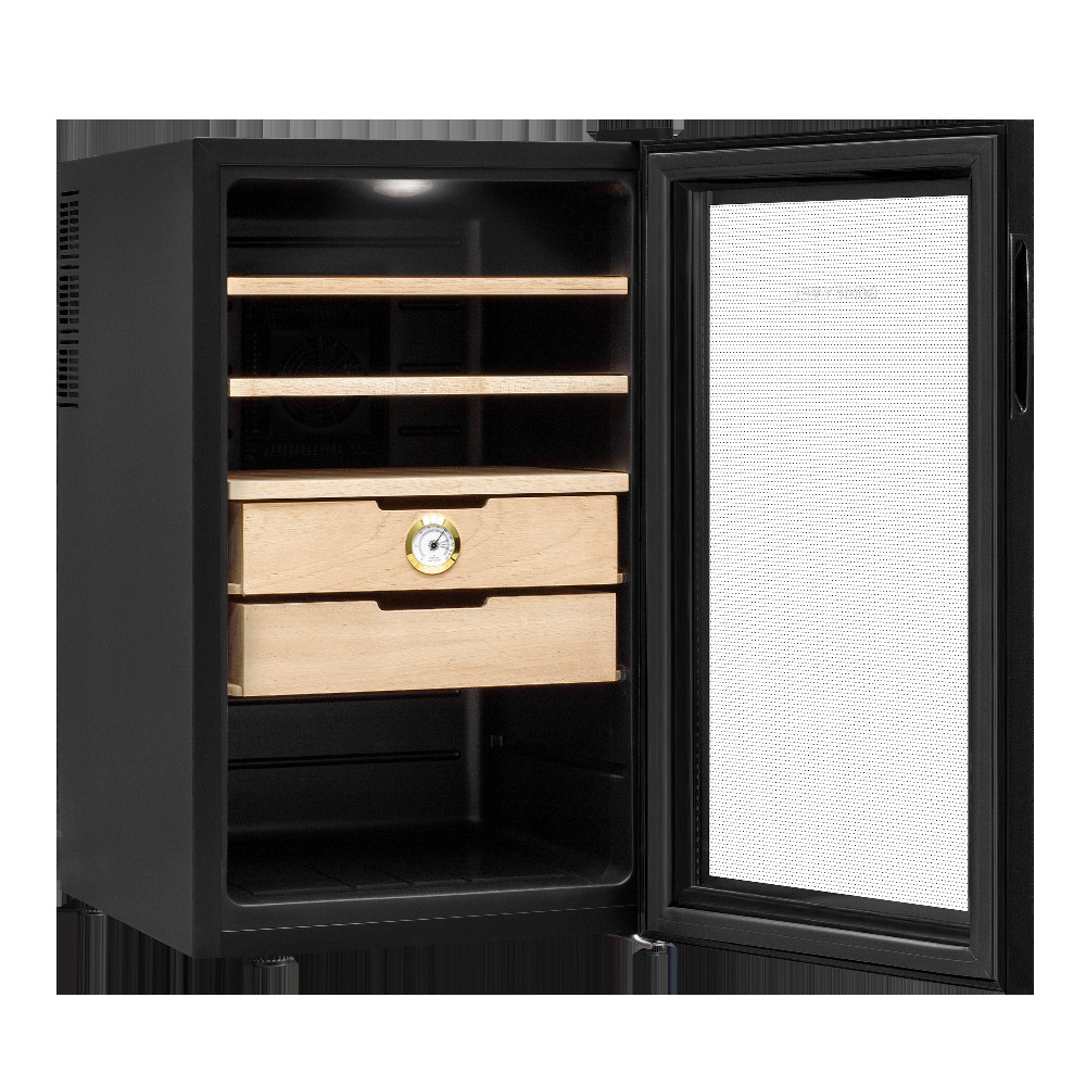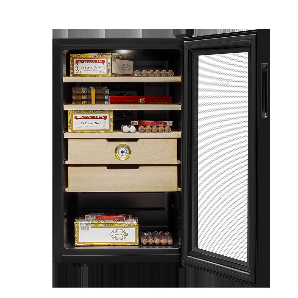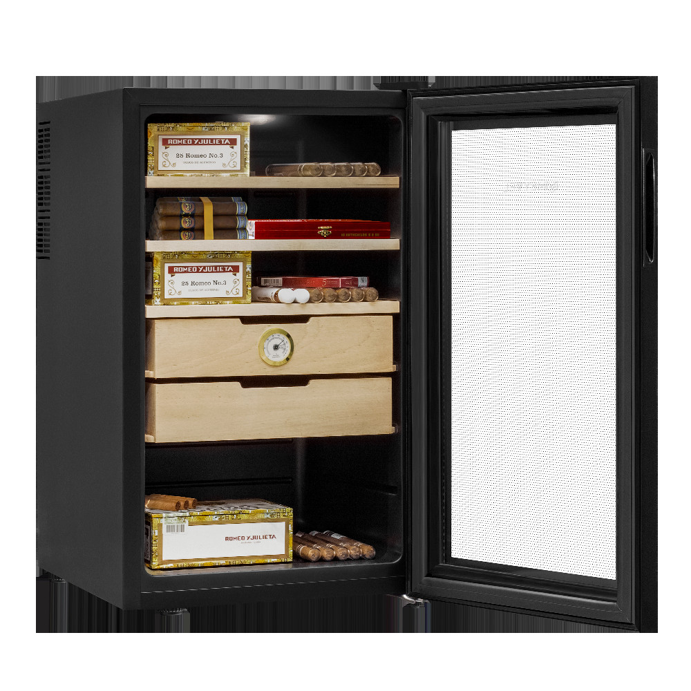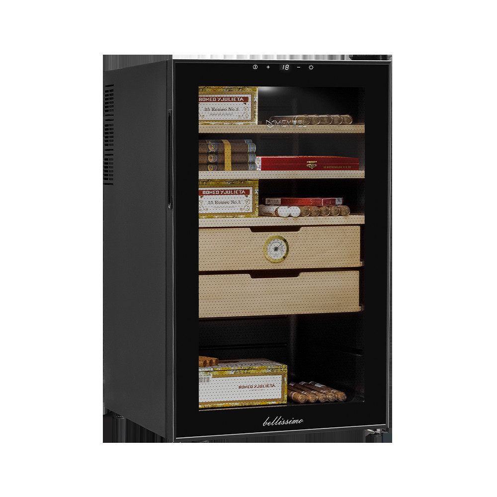 В ящике хьюмидора Meyvel MC-70BT встроен гигрометр, с помощью которого удобно отслеживать уровень влажности. Панель управления с электронным дисплеем позволит настроить необходимую температуру в диапазоне от +10C° до +18C°, включить или отключить внутреннее освещение. Уровень шума не превышает 41дБ.