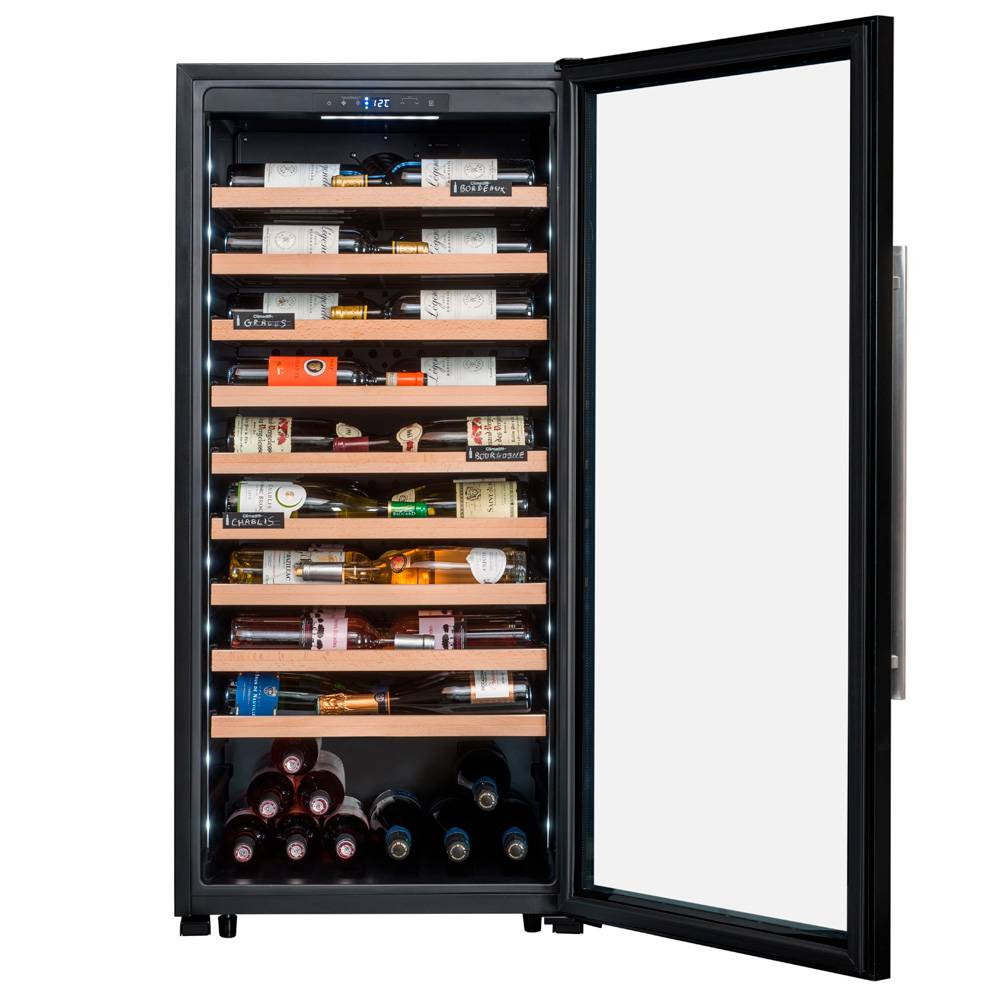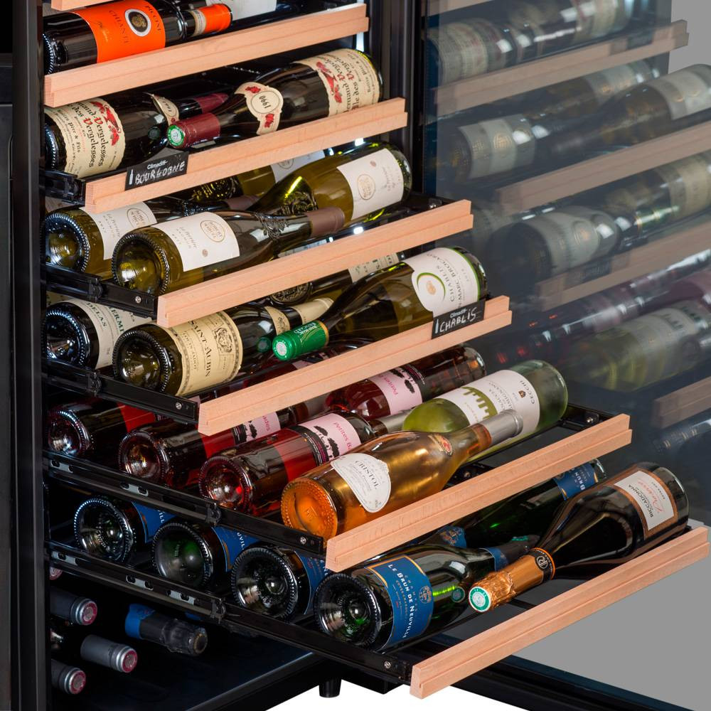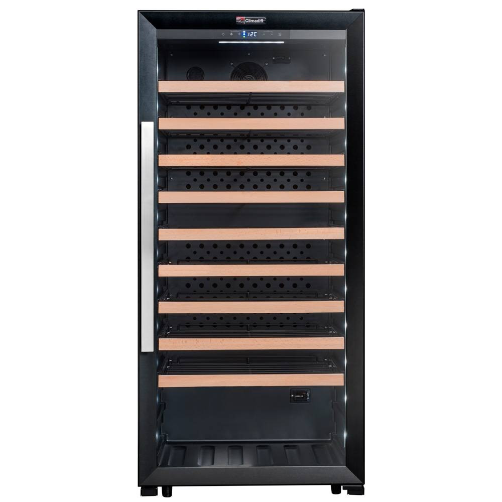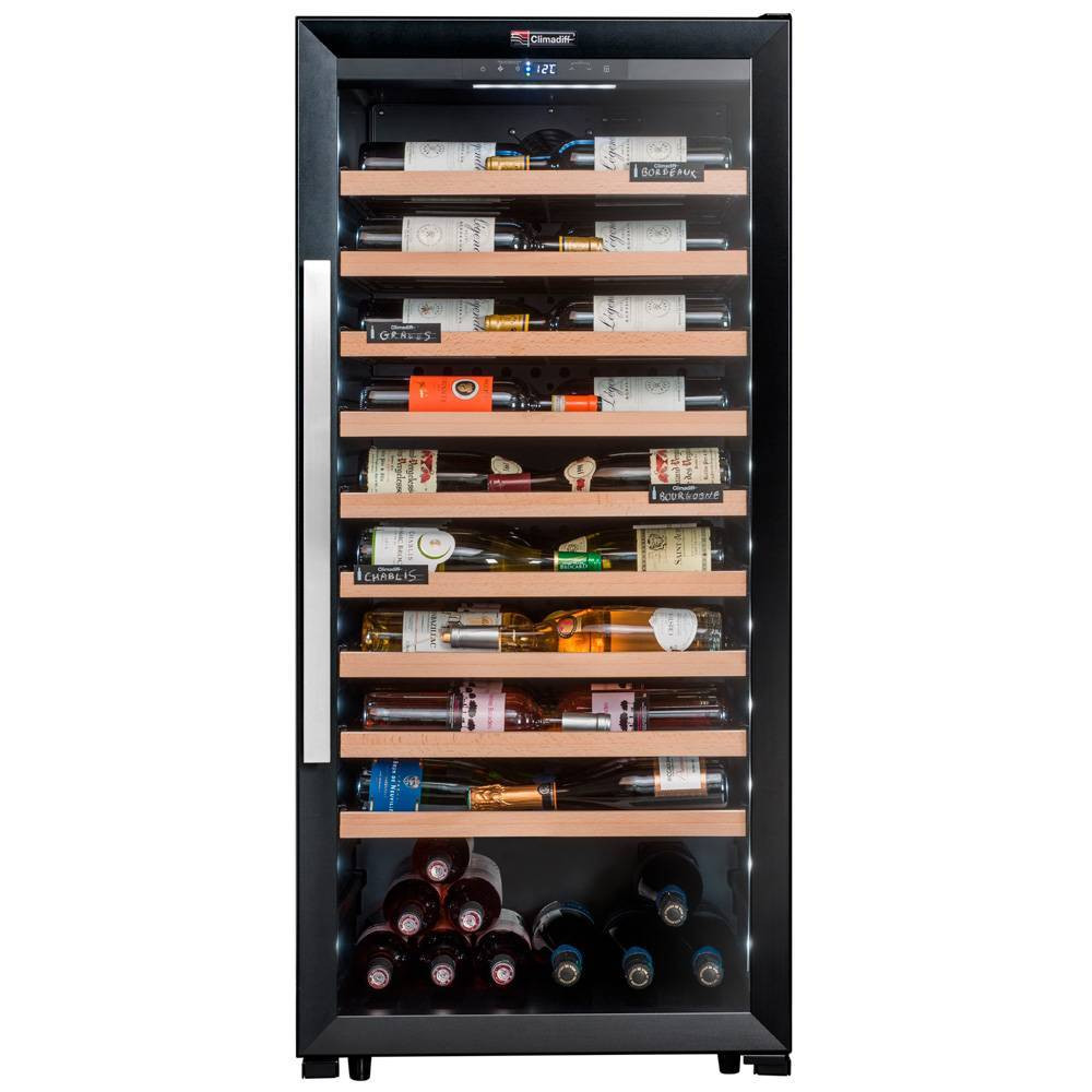 Особенность данной модели винного холодильника Climadiff заключается в полках, на которых бутылки лежат этикеткой к стеклу, что позволяет использовать винный шкаф не только для хранения, но и для демонстрации винной коллекции в ресторанах и в винных магазинах.