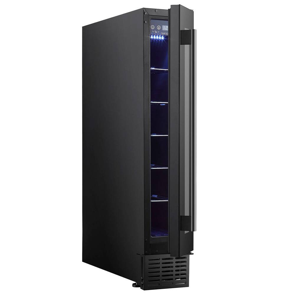Стильный дизайн с передней панелью из черного стекла, полками из бука и внутренней светодиодной подсветкой.