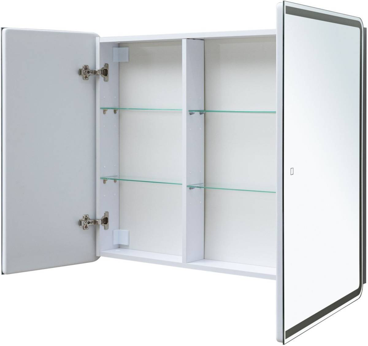 Корпус шкафа изготовлен из влагостойкой ЛДСП белого цвета. Внутри расположены съемные полки из стекла толщиной 4 мм. Петли оснащены доводчиком для плавного закрывания. Подводка электричества выполнена через петли, что делает подключение удобным.