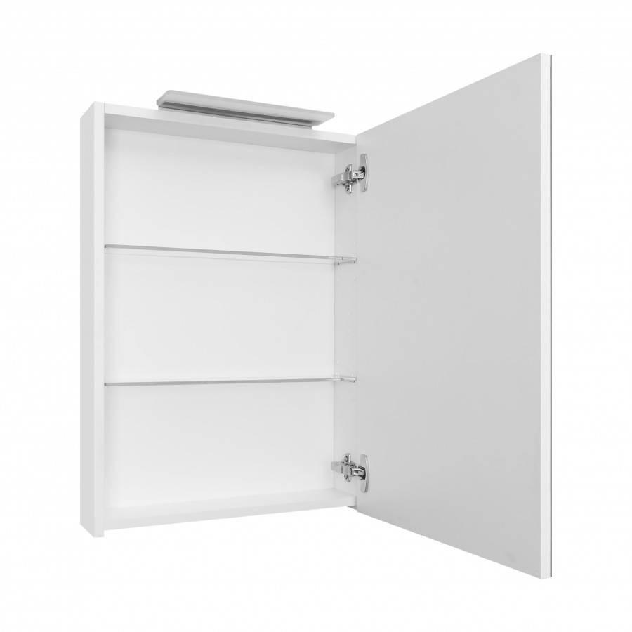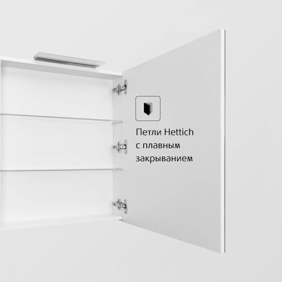 Зеркальный шкаф OLETA оснащен светильником от европейского бренда с возможностью регулировки положения, IP 44, 5 700 K. Теплота света у светильника 5 700 K - это яркий свет, идеальный для нанесения макияжа и бритья. Положение светильника можно регулировать: наклонить слегка вниз или направить свет повыше. За зеркальными фасадами расположены регулируемые по высоте полочки из просветленного стекла. Фасады оснащены петлями Hettich с плавным закрыванием.