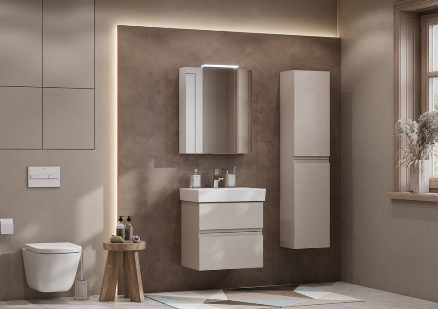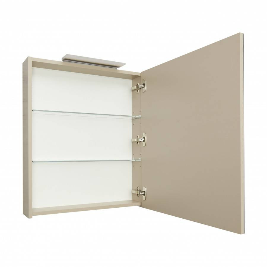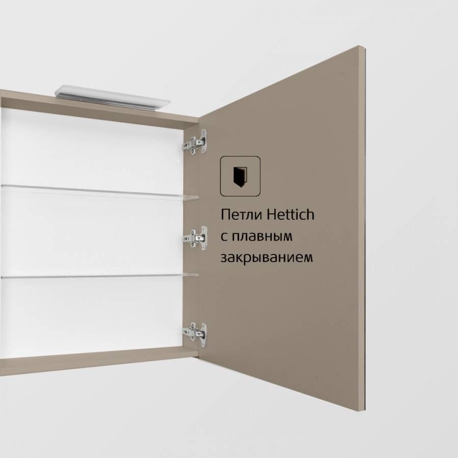 Зеркальный шкаф OLETA оснащен светильником от европейского бренда с возможностью регулировки положения, IP 44, 5 700 K. Теплота света у светильника 5 700 K - это яркий свет, идеальный для нанесения макияжа и бритья. Положение светильника можно регулировать: наклонить слегка вниз или направить свет повыше. За зеркальными фасадами расположены регулируемые по высоте полочки из просветленного стекла. Фасады оснащены петлями Hettich с плавным закрыванием.