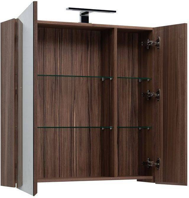 Зеркало-шкаф Aquanet Нью-Йорк 85 (орех) не нуждается в дополнительных декоративных деталях, живописной фурнитуре – шпон ореха, используемый в качестве покрытия, выполняет функции декорирования наилучшим образом. Зоны хранения в шкафчике шириной 85 см распределены по полочкам, скрытым за двумя фасадами, на которых закреплены зеркальные полотна, предназначенные для использования во влажных помещениях. Плавность открывания-закрывания дверок обеспечивает фурнитура немецкой компании Hettich. Корпус традиционно для мебели Aquanet выполнен из влагостойкой ЛДСП, фасады – из МДФ.